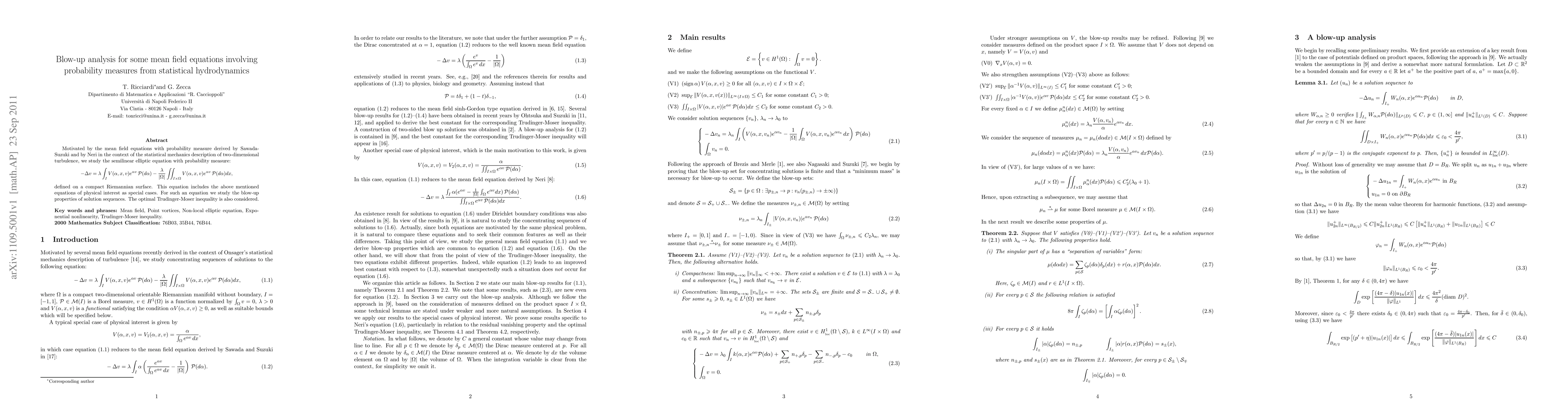 Motivated by the mean field equations with probability measure derived by Sawada-Suzuki and by Neri in the context of the statistical mechanics description of two-dimensional turbulence, we study the semilinear elliptic equation with probability measure: {equation*} -\Delta v=\lambda\int_I V(\alpha,x,v)e^{\alpha v}\,\Pda -\frac{\lambda}{|\Omega|}\iint_{I\times\Om}V(\alpha,x,v)e^{\alpha v}\,\Pda dx, {equation*} defined on a compact Riemannian surface. This equation includes the above mentioned equations of physical interest as special cases. For such an equation we study the blow-up properties of solution sequences. The optimal Trudinger-Moser inequality is also considered.