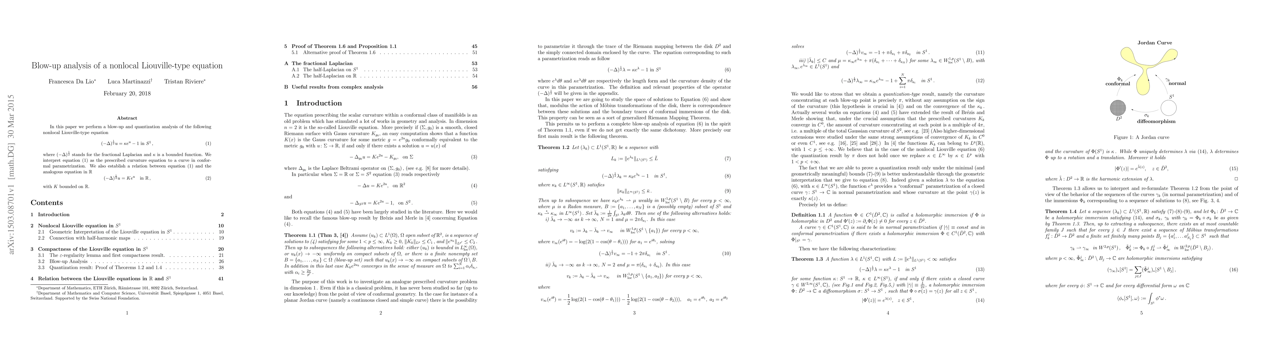In this paper we perform a blow-up and quantization analysis of the following nonlocal Liouville-type equation \begin{equation}(-\Delta)^\frac12 u= \kappa e^u-1~\mbox{in $S^1$,} \end{equation} where $(-\Delta)^\frac{1}{2}$ stands for the fractional Laplacian and $\kappa$ is a bounded function. We interpret the above equation as the prescribed curvature equation to a curve in conformal parametrization. We also establish a relation between this equation and the analogous equation in $\mathbb{R}$ \begin{equation} (-\Delta)^\frac{1}{2} u =Ke^u \quad \text{in }\mathbb{R}, \end{equation} with $K$ bounded on $\mathbb{R}$.
