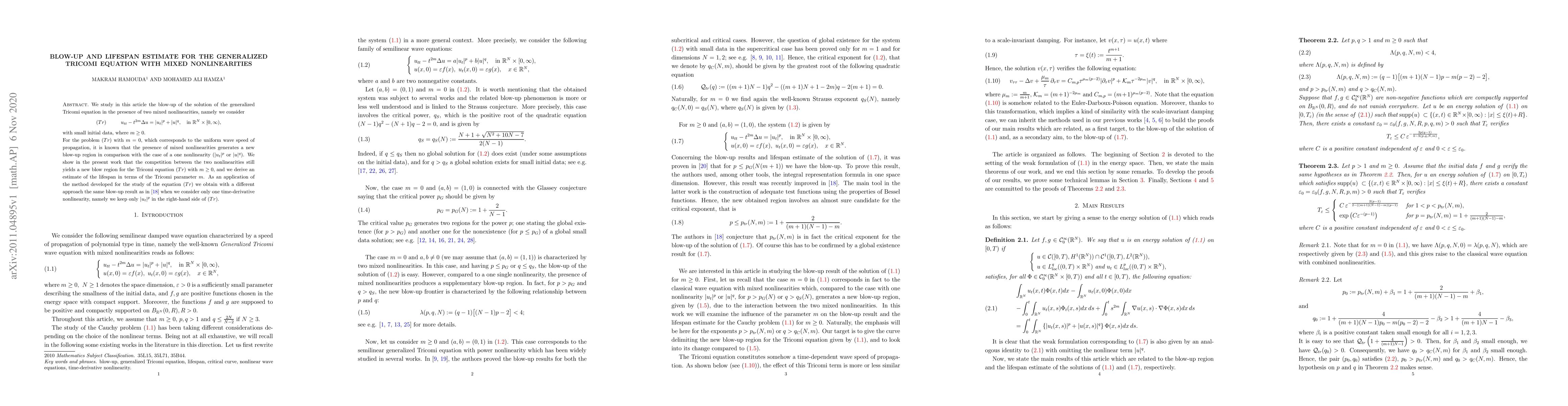 This paper investigates the blow-up behavior of solutions to the generalized Tricomi equation with mixed nonlinearities, deriving a new blow-up region due to the competition between the nonlinearities. It provides a lifespan estimate for the equation in terms of the Tricomi parameter $m$.