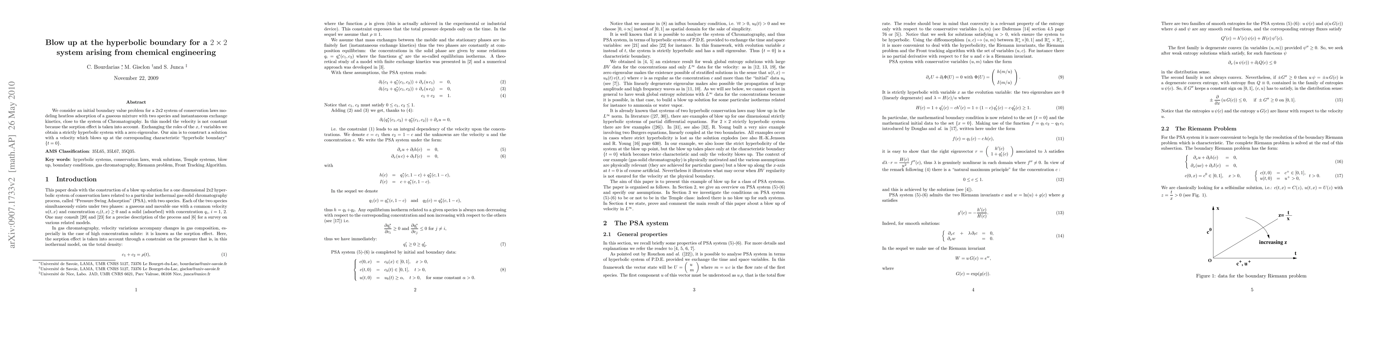 We consider an initial boundary value problem for a 2x2 system of conservation laws modeling heatless adsorption of a gaseous mixture with two species and instantaneous exchange kinetics, close to the system of Chromatography. In this model the velocity is not constant because the sorption effect is taken into account. Exchanging the roles of the x, t variables we obtain a strictly hyperbolic system with a zero eigenvalue. Our aim is to construct a solution with a velocity which blows up at the corresponding characteristic "hyperbolic boundary" {t = 0}.