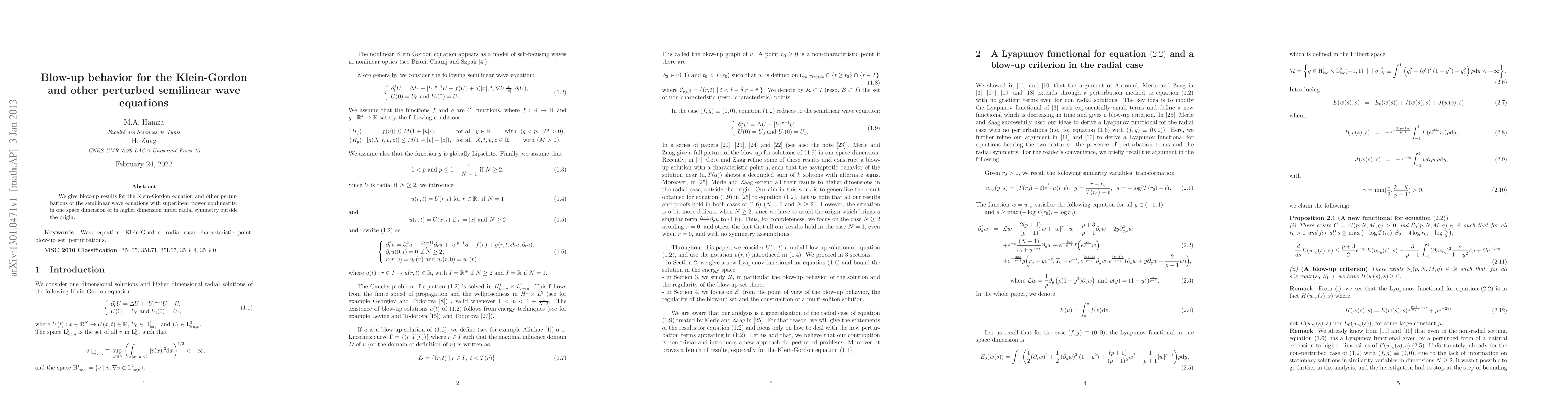 Summary: This paper presents blow-up results for the Klein-Gordon equation and related perturbed semilinear wave equations with superlinear power nonlinearity, focusing on radial symmetry scenarios in both one and higher dimensions.