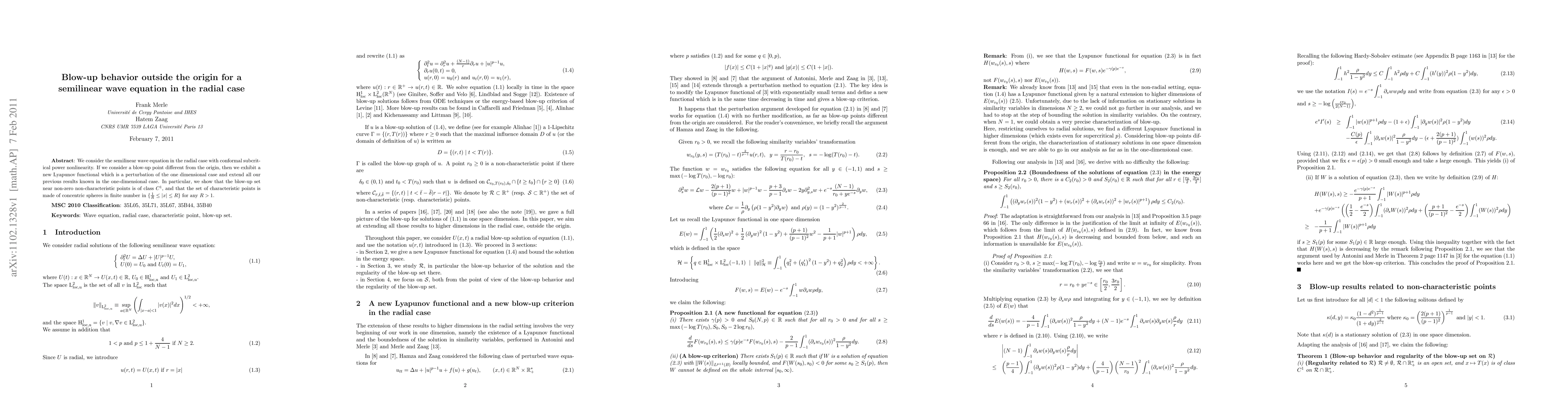 We consider the semilinear wave equation in the radial case with conformal subcritical power nonlinearity. If we consider a blow-up point different from the origin, then we exhibit a new Lyapunov functional which is a perturbation of the one dimensional case and extend all our previous results known in the one-dimensional case. In particular, we show that the blow-up set near non-zero non-characteristic points is of class $C^1$, and that the set of characteristic points is made of concentric spheres in finite number in $\{\frac 1R \le |x|\le R\}$ for any $R>1$.