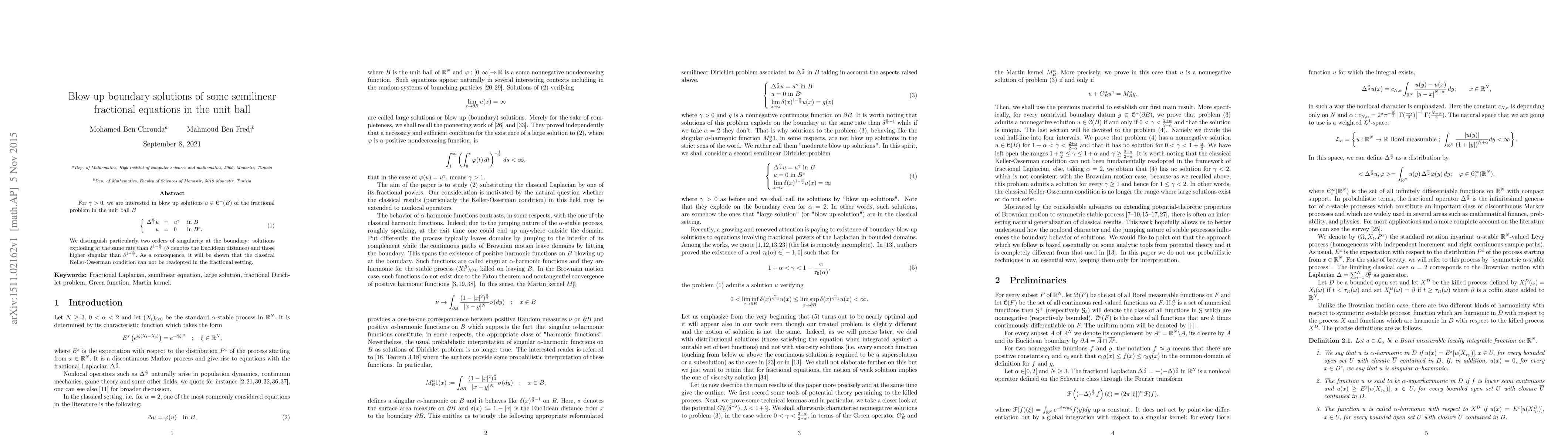 Research investigates blow-up solutions for semilinear fractional equations in the unit ball, finding that classical Keller-Osserman conditions cannot be adopted in the fractional setting, with solutions exhibiting different rates of singularity at the boundary.