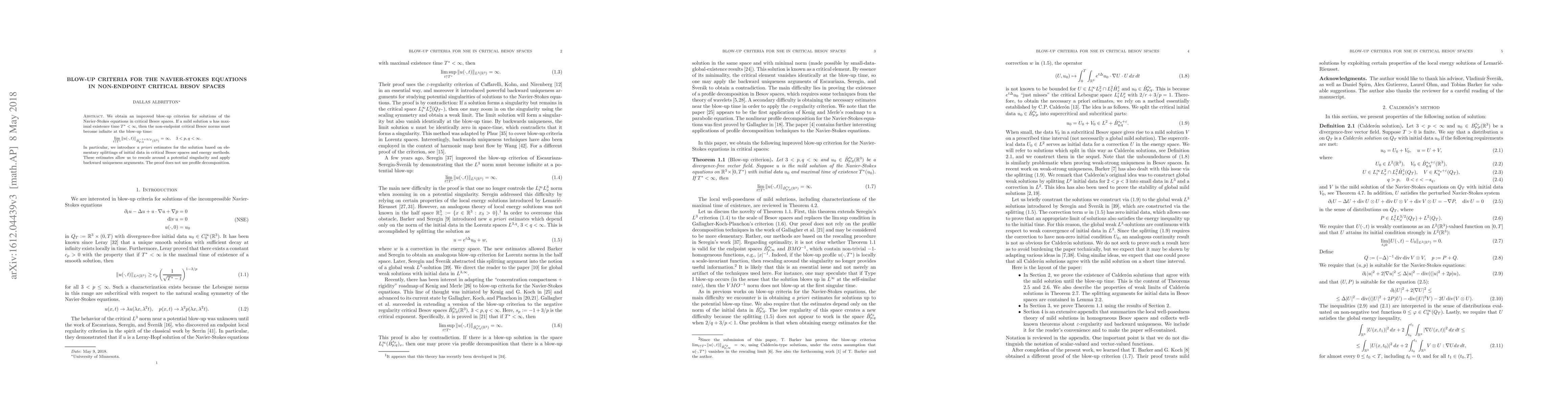 This paper presents an improved blow-up criterion for the Navier-Stokes equations, showing that if a solution blows up, the critical Besov norms become infinite. The authors use a priori estimates and rescaling techniques to prove this criterion without employing profile decomposition.