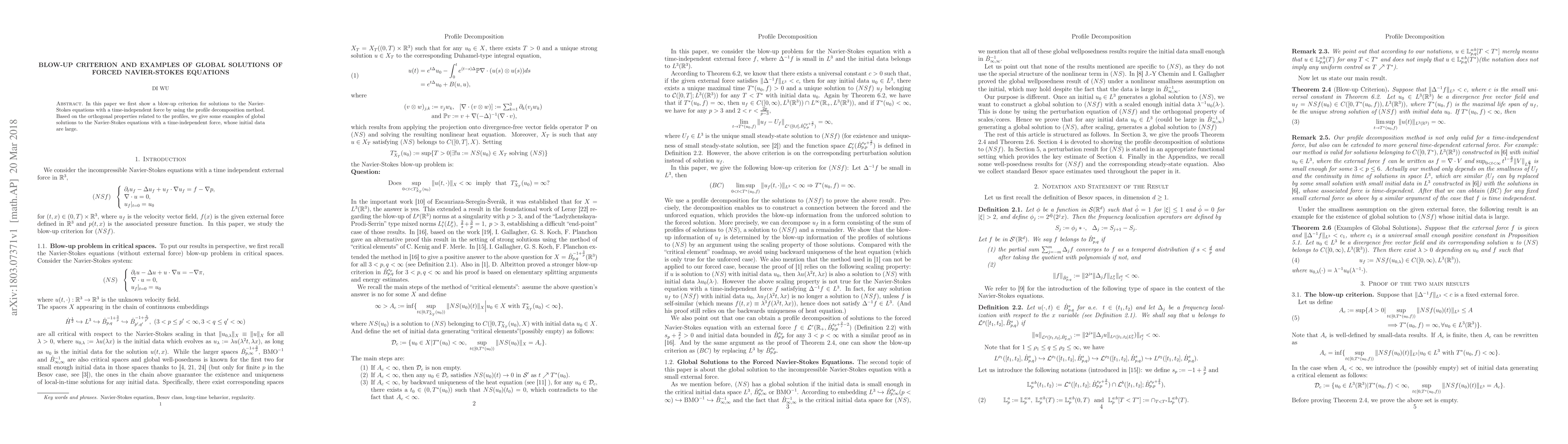 This paper establishes a blow-up criterion for solutions to the Navier-Stokes equations under a time-independent force using the profile decomposition method. It also provides examples of global solutions with large initial data, demonstrating the applicability of the derived criterion.