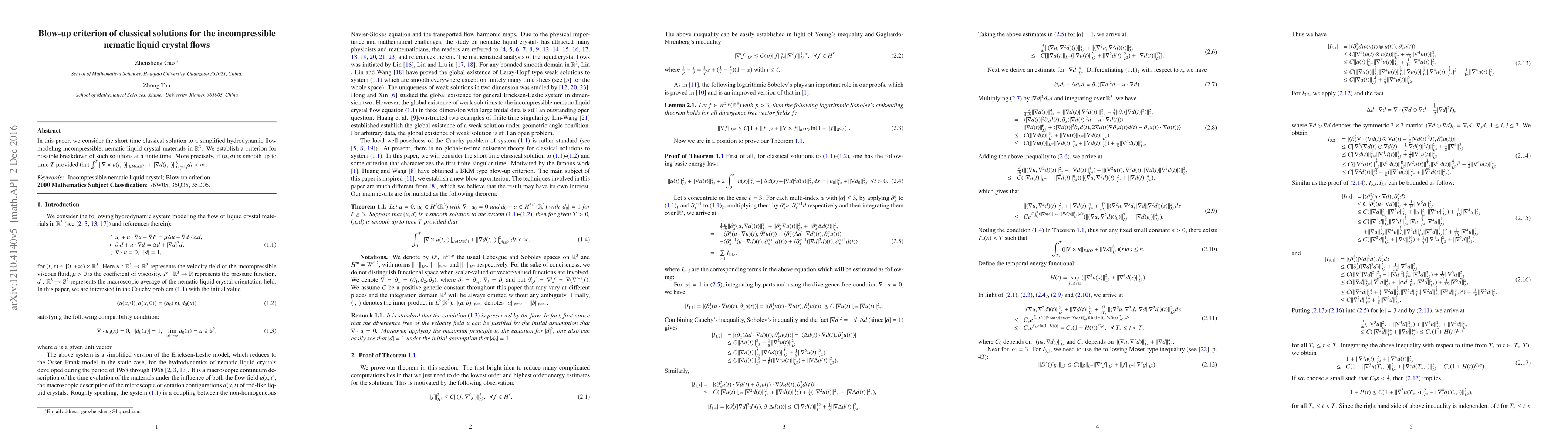 In this paper, we consider the short time classical solution to a simplified hydrodynamic flow modeling incompressible, nematic liquid crystal materials in dimension three. We establish a criterion for possible breakdown of such solutions at a finite time. More precisely, if $(u,d)$ is smooth up to time $T$ provided that $\int_0^T|\nabla\times u(t,\cdot)|_{BMO(\mathbb R^3)}+|\nabla d(t,\cdot)|^8_{L^4(\mathbb R^3)}dt<\infty $