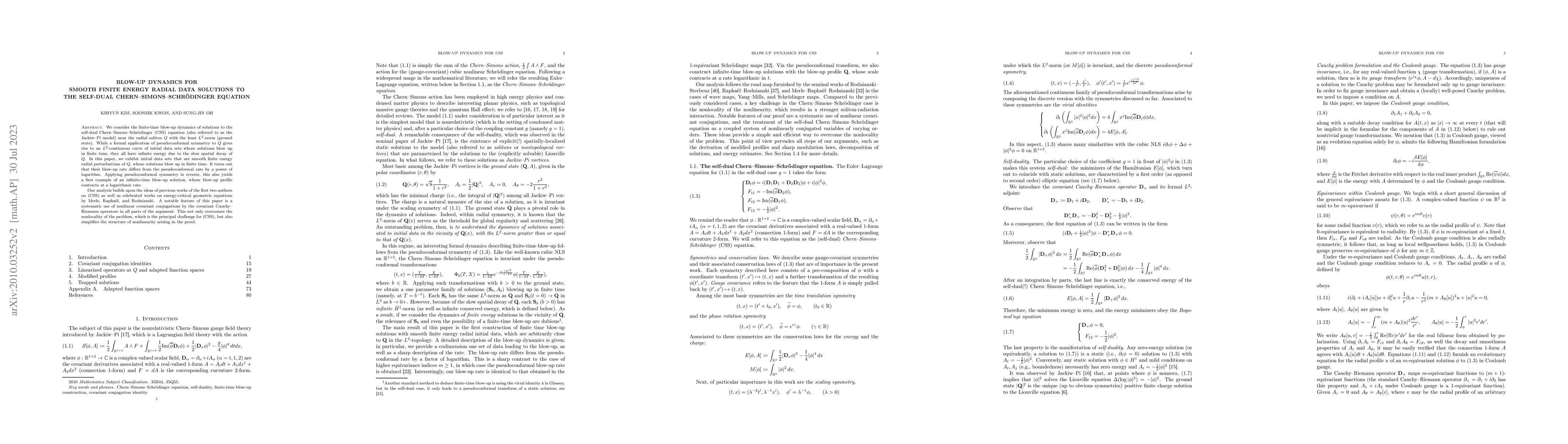 We consider the finite-time blow-up dynamics of solutions to the self-dual Chern-Simons-Schr\"odinger (CSS) equation (also referred to as the Jackiw-Pi model) near the radial soliton $Q$ with the least $L^{2}$-norm (ground state). While a formal application of pseudoconformal symmetry to $Q$ gives rise to an $L^{2}$-continuous curve of initial data sets whose solutions blow up in finite time, they all have infinite energy due to the slow spatial decay of $Q$. In this paper, we exhibit initial data sets that are smooth finite energy radial perturbations of $Q$, whose solutions blow up in finite time. Interestingly, their blow-up rate differs from the pseudoconformal rate by a power of logarithm. Applying pseudoconformal symmetry in reverse, this also yields a first example of an infinite-time blow-up solution, whose blow-up profile contracts at a logarithmic rate. Our analysis builds upon the ideas of previous works of the first two authors on (CSS) [21,22], as well as the celebrated works on energy-critical geometric equations by Merle, Rapha\"el, and Rodnianski [33,38]. A notable feature of this paper is a systematic use of nonlinear covariant conjugations by the covariant Cauchy-Riemann operators in all parts of the argument. This not only overcomes the nonlocality of the problem, which is the principal challenge for (CSS), but also simplifies the structure of nonlinearity arising in the proof.