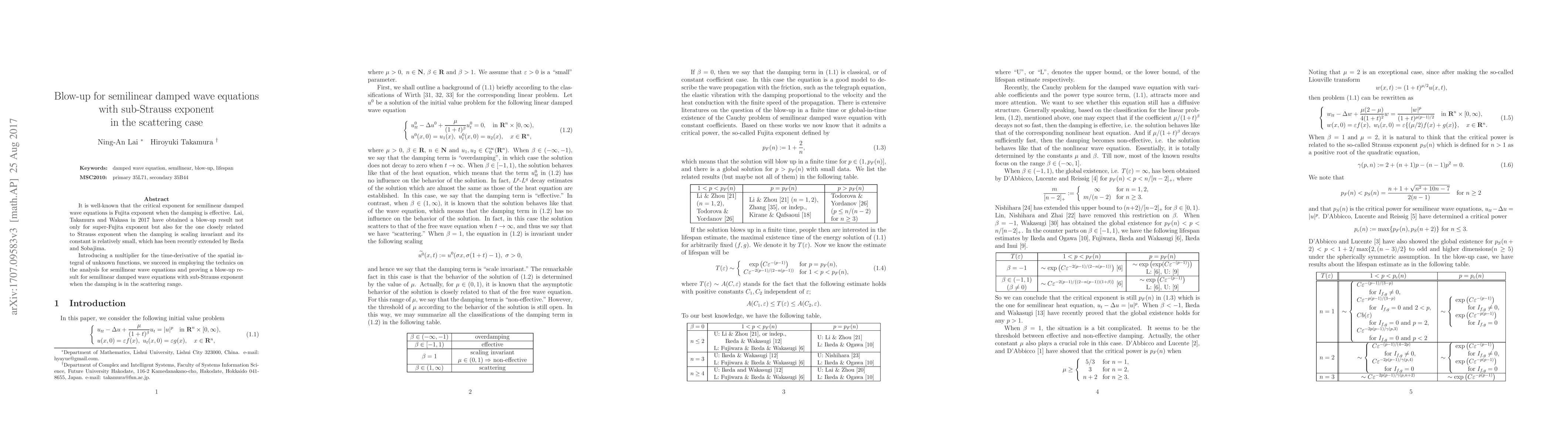 This paper proves a blow-up result for semilinear damped wave equations with sub-Strauss exponent under scattering damping conditions. The authors introduce a new multiplier technique to extend previous results on super-Fujita and Strauss exponent blow-up scenarios.