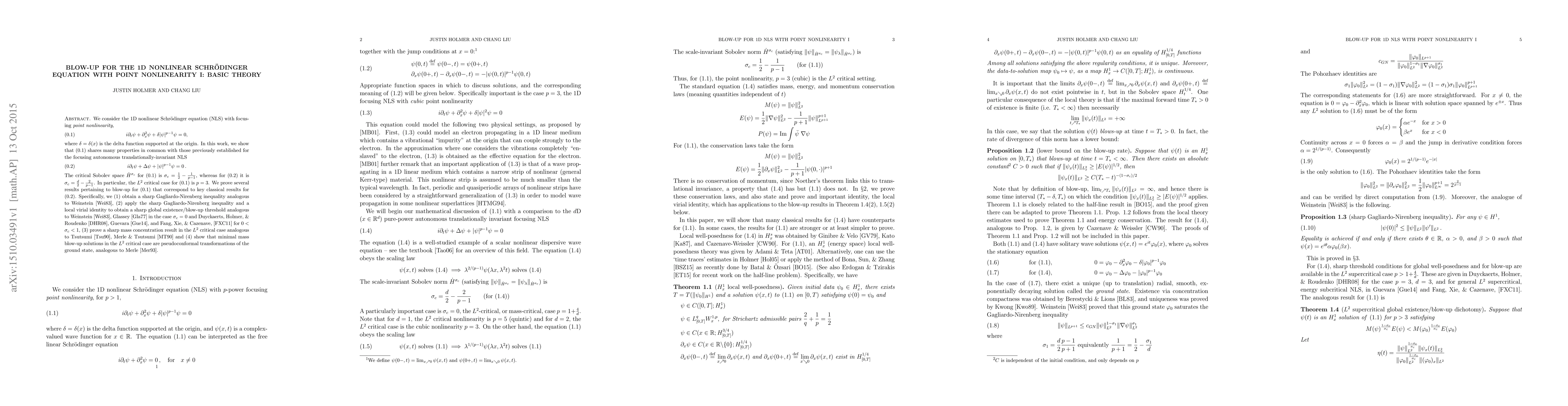 This paper investigates the 1D nonlinear Schrödinger equation with a focusing point nonlinearity. It establishes analogous properties between this equation and the standard NLS, particularly proving results on blow-up criteria and critical mass concentration, and showing that minimal mass blow-up solutions are pseudoconformal transformations of the ground state.