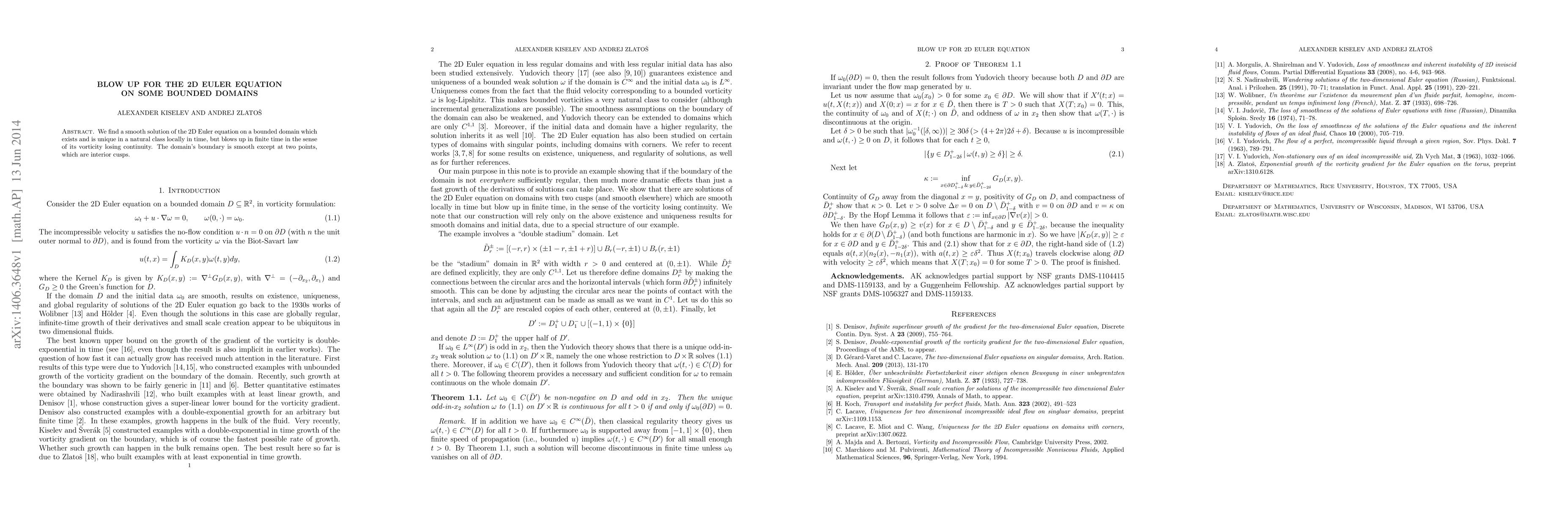 We find a smooth solution of the 2D Euler equation on a bounded domain which exists and is unique in a natural class locally in time, but blows up in finite time in the sense of its vorticity losing continuity. The domain's boundary is smooth except at two points, which are interior cusps.
