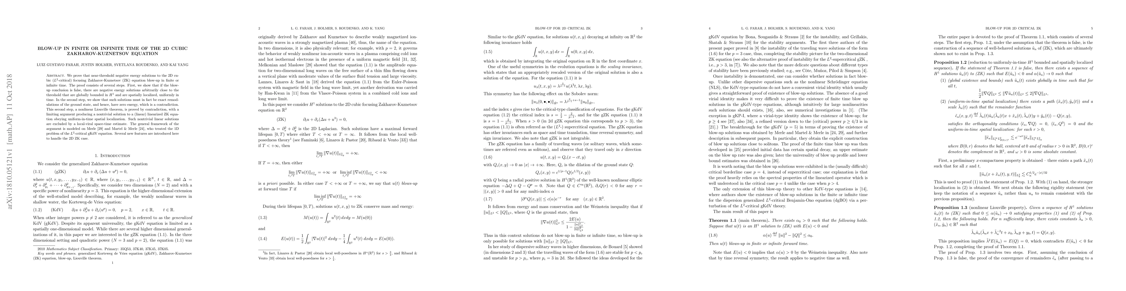 This paper proves that certain low-energy solutions to the 2D cubic Zakharov-Kuznetsov equation either blow up in finite or infinite time, using a multi-step proof involving a nonlinear Liouville theorem and contradiction arguments.