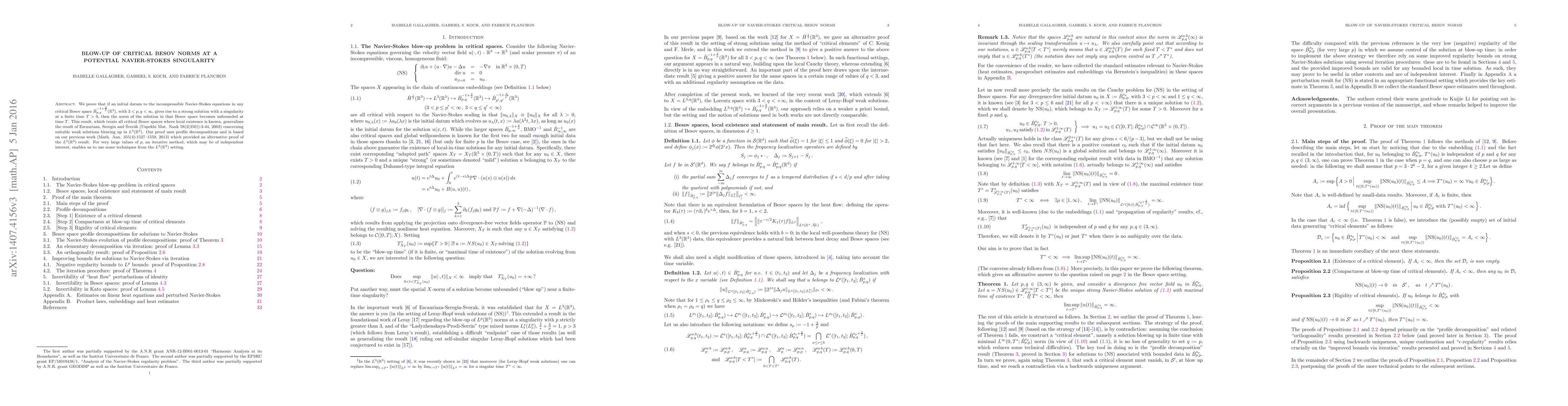0$, then the norm of the solution in that Besov space becomes unbounded at time $T$. This result, which treats all critical Besov spaces where local existence is known, generalizes the result of Escauriaza, Seregin and Sverak (Uspekhi Mat. Nauk 58(2(350)):3-44, 2003) concerning suitable weak solutions blowing up in $L^3(\mathbb{R}^3)$. Our proof uses profile decompositions and is based on our previous work (Math. Ann. 355(4):1527--1559, 2013) which provided an alternative proof of the $L^3(\mathbb{R}^3)$ result. For very large values of $p$, an iterative method, which may be of independent interest, enables us to use some techniques from the $L^3(\mathbb{R}^3)$ setting. (To appear in Communications in Mathematical Physics.)