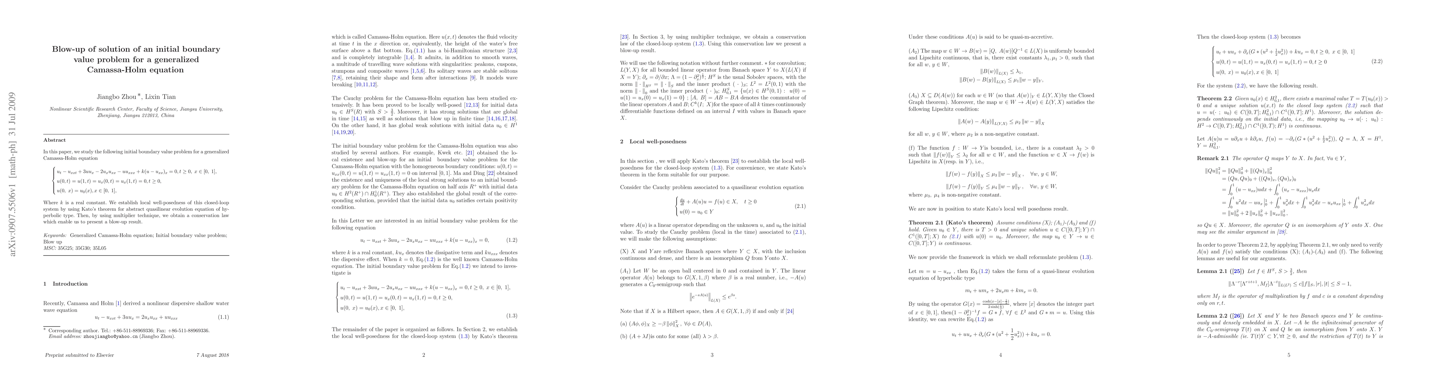In this paper, we study an initial boundary value problem for a generalized Camassa-Holm equation. We establish local well-posedness of this closed-loop system by using Kato theorem for abstract quasilinear evolution equation of hyperbolic type. Then, by using multiplier technique, we obtain a conservation law which enable us to present a blow-up result.