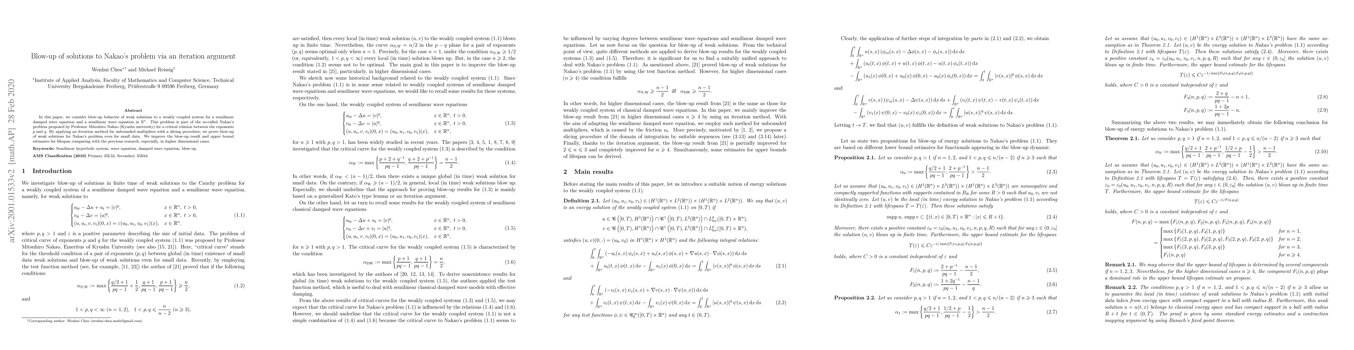 In this paper, we consider blow-up behavior of weak solutions to a weakly coupled system for a semilinear damped wave equation and a semilinear wave equation in $\mathbb{R}^n$. This problem is part of the so-called Nakao's problem proposed by Professor Mitsuhiro Nakao (Kyushu University) for a critical relation between the exponents $p$ and $q$. By applying an iteration method for unbounded multipliers with a slicing procedure, we prove blow-up of weak solutions for Nakao's problem even for small data. We improve the blow-up result and upper bound estimates for lifespan comparing with the previous research, especially, in higher dimensional cases.