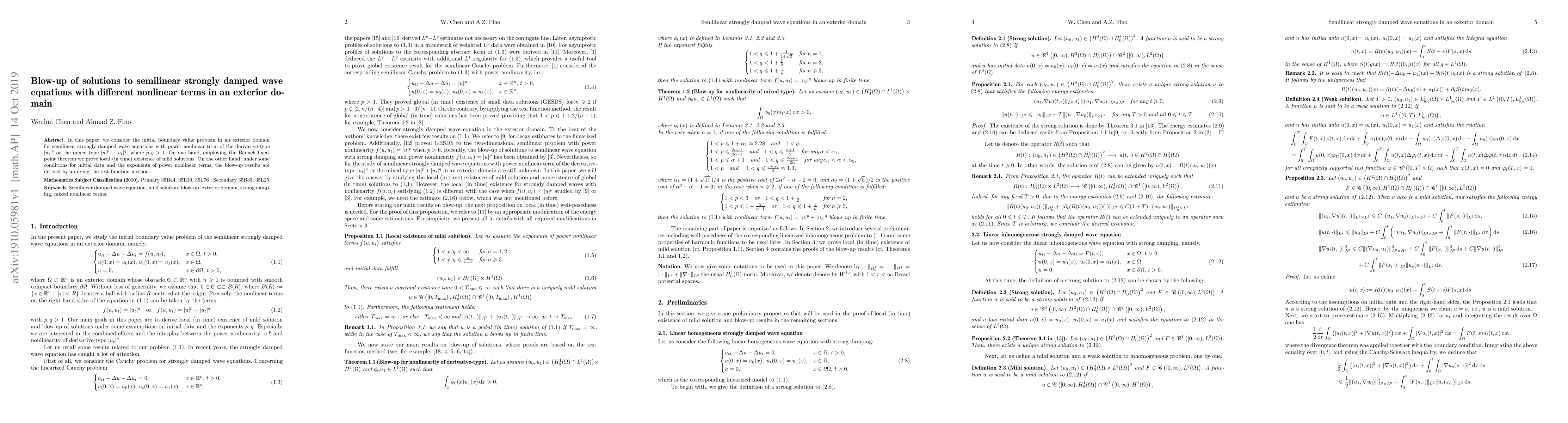 In this paper, we consider the initial boundary value problem in an exterior domain for semilinear strongly damped wave equations with power nonlinear term of the derivative-type $|u_t|^q$ or the mixed-type $|u|^p+|u_t|^q$, where $p,q>1$. On one hand, employing the Banach fixed-point theorem we prove local (in time) existence of mild solutions. On the other hand, under some conditions for initial data and the exponents of power nonlinear terms, the blow-up results are derived by applying the test function method.