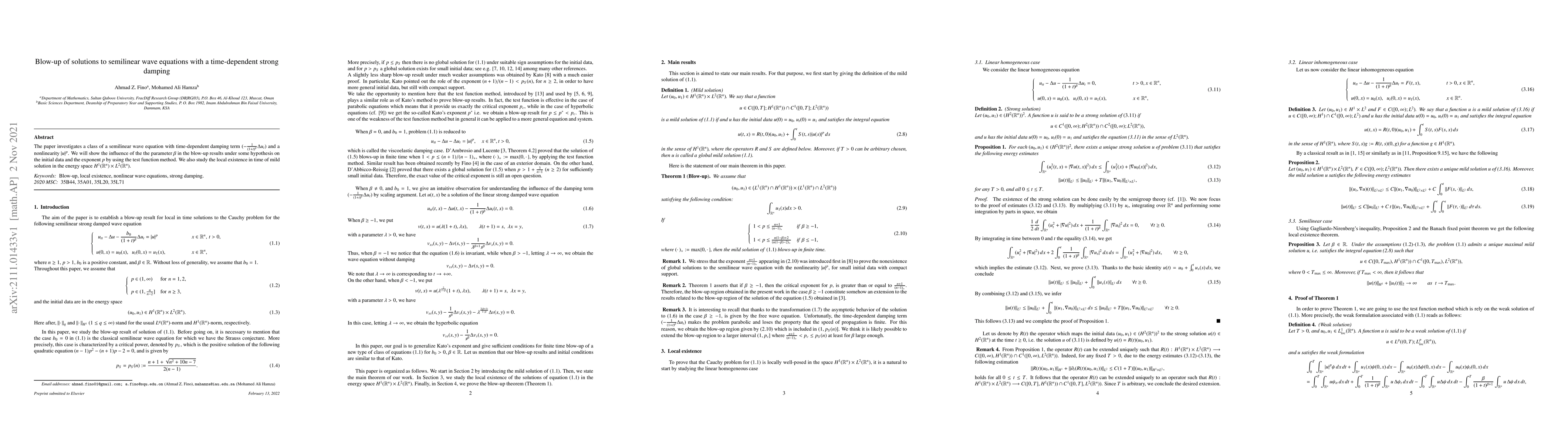 This paper examines semilinear wave equations with a time-dependent damping term and a nonlinear term, focusing on the influence of the damping parameter $\beta$ on blow-up results. It also explores local existence of mild solutions in the energy space using the test function method.