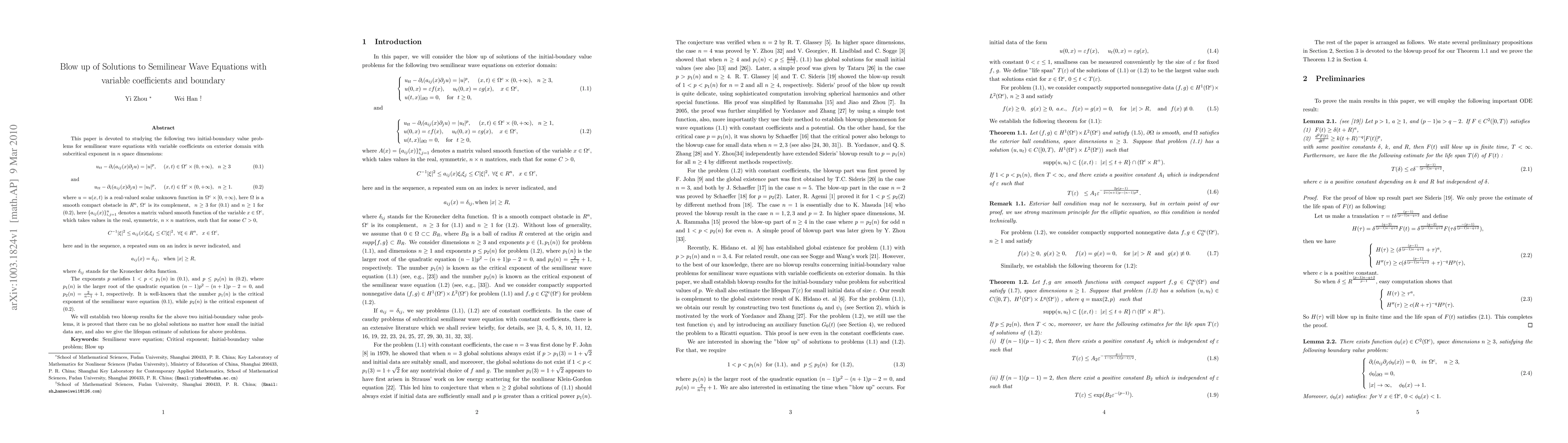 This paper investigates the blowup of solutions to semilinear wave equations with variable coefficients and boundary conditions in exterior domains. It establishes blowup results for two initial-boundary value problems, proving that no global solutions exist even for small initial data, and provides a lifespan estimate for the solutions.