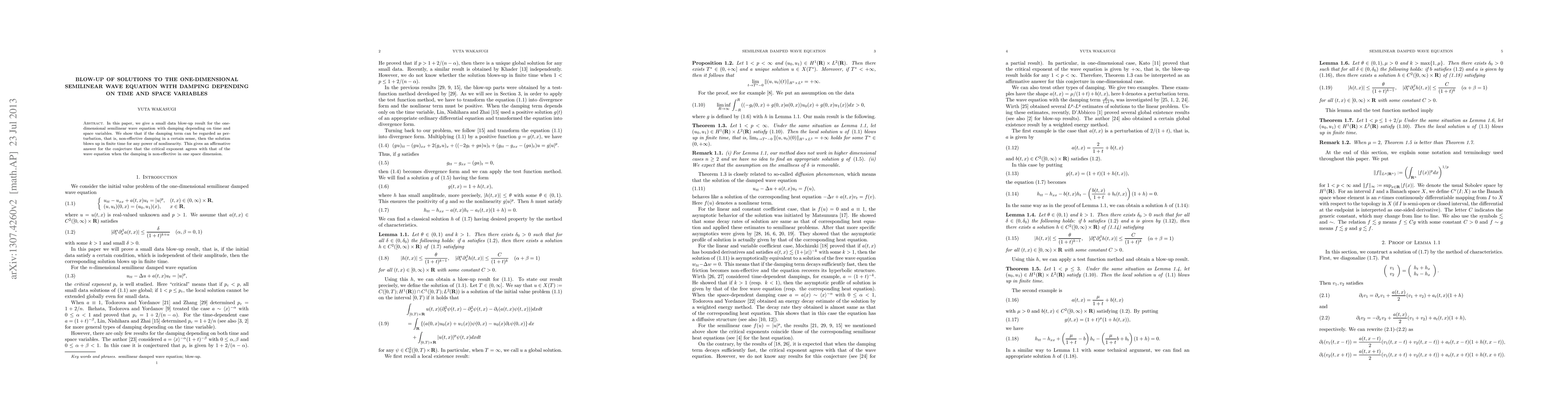 This paper demonstrates a small data blow-up result for the one-dimensional semilinear wave equation with damping that varies with time and space. It confirms that if the damping is considered a non-effective perturbation, solutions will blow up in finite time regardless of the nonlinearity's power, supporting the conjecture about the critical exponent in one spatial dimension.