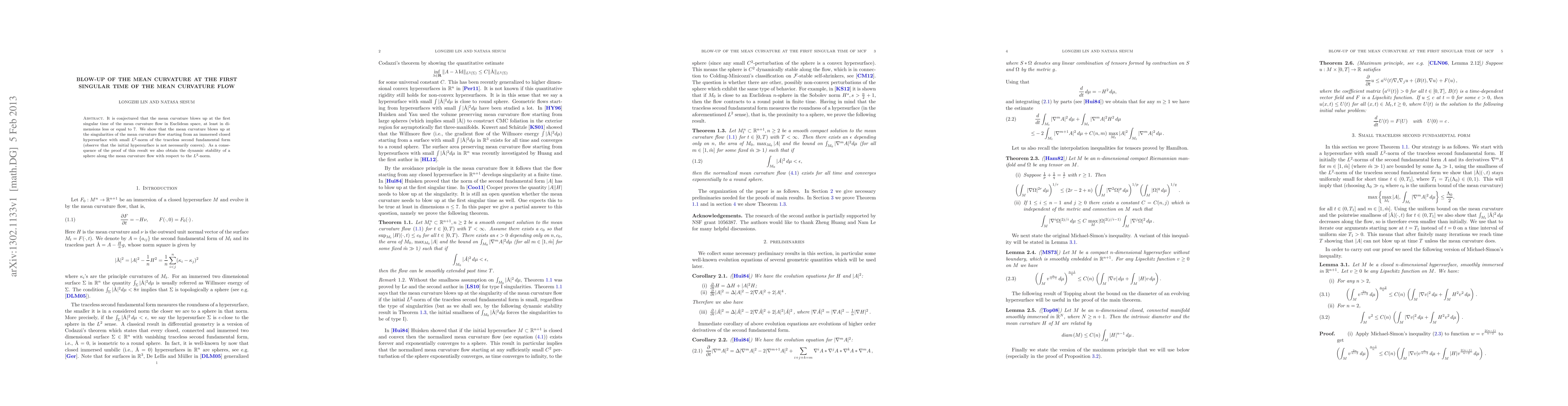 This paper proves that the mean curvature of an immersed closed hypersurface in Euclidean space blows up at the first singular time of the mean curvature flow, provided the initial hypersurface has a small L^2-norm of the traceless second fundamental form. It also establishes the dynamic stability of a sphere under mean curvature flow with respect to the L^2-norm.