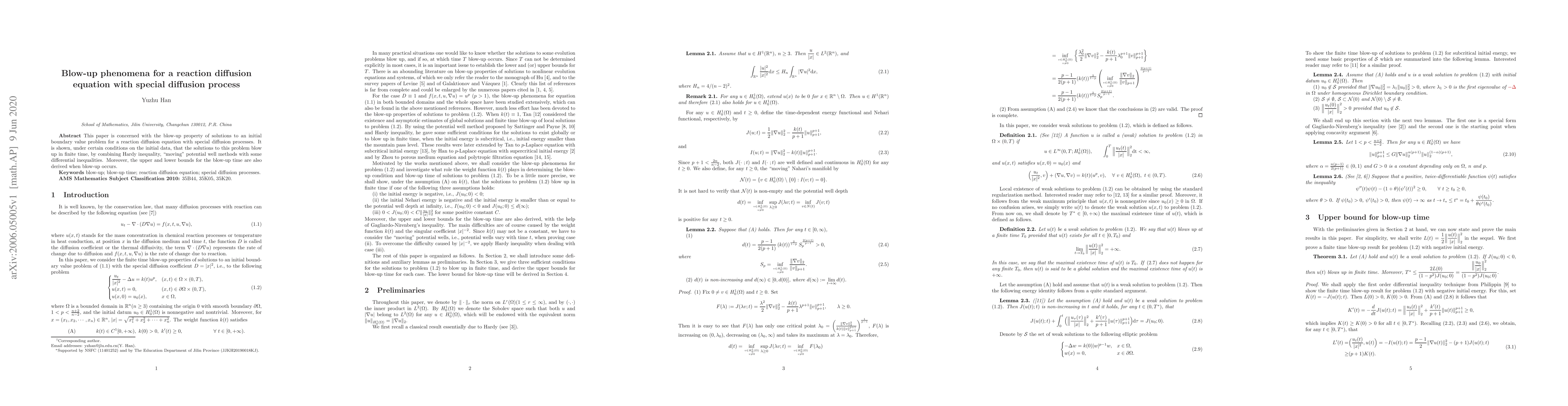 This research investigates the blow-up behavior of solutions to a reaction diffusion equation with unique diffusion processes, demonstrating that under specific initial conditions, solutions will blow up in finite time using Hardy inequality and moving potential well methods. It also derives upper and lower bounds for the blow-up time.