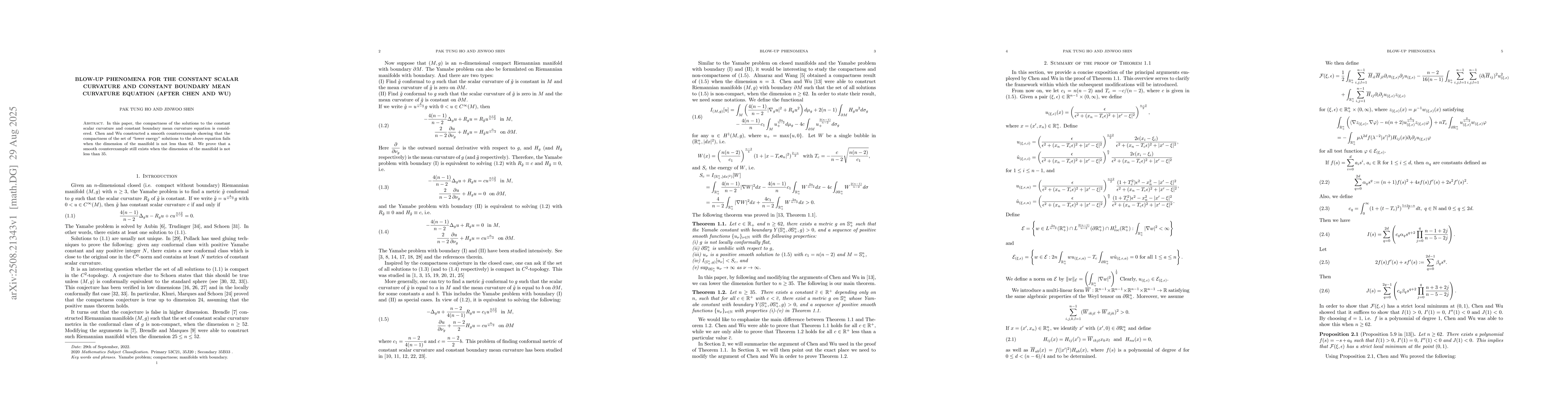In this paper, the compactness of the solutions to the constant scalar curvature and constant boundary mean curvature equation is considered. Chen and Wu constructed a smooth counterexample showing that the compactness of the set of ``lower energy" solutions to the above equation fails when the dimension of the manifold is not less than 62. We prove that a smooth counterexample still exists when the dimension of the manifold is not less than 35.