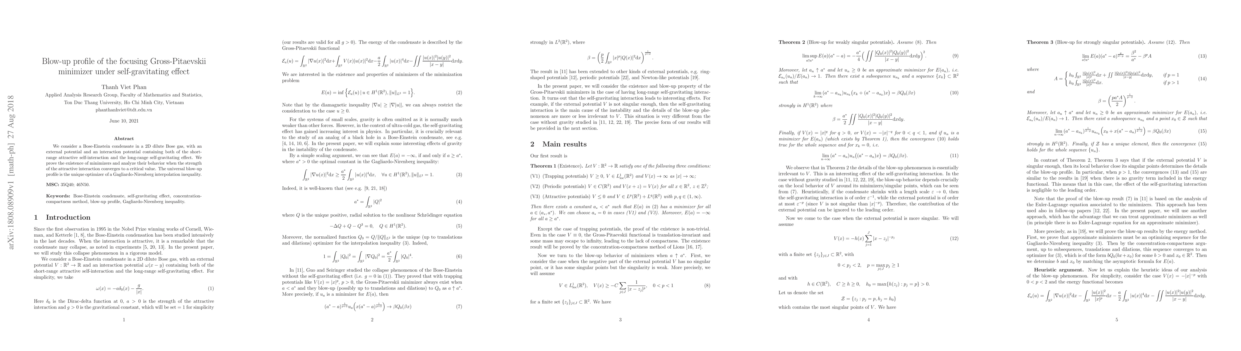 We consider a Bose-Einstein condensate in a 2D dilute Bose gas, with an external potential and an interaction potential containing both of the short-range attractive self-interaction and the long-range self-gravitating effect. We prove the existence of minimizers and analyze their behavior when the strength of the attractive interaction converges to a critical value. The universal blow-up profile is the unique optimizer of a Gagliardo-Nirenberg interpolation inequality.