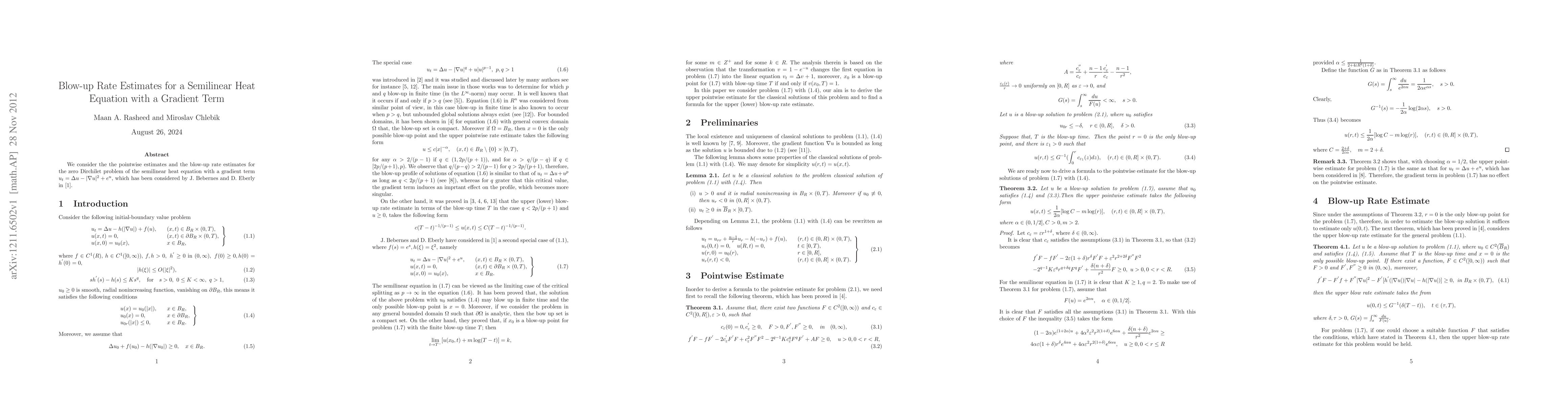 **Summary:** This paper examines pointwise estimates and blow-up rate for solutions to a semilinear heat equation involving a gradient term, focusing on the zero Dirichlet boundary condition. It aims to provide insights into the behavior and characteristics of solutions leading to finite-time blow-up.