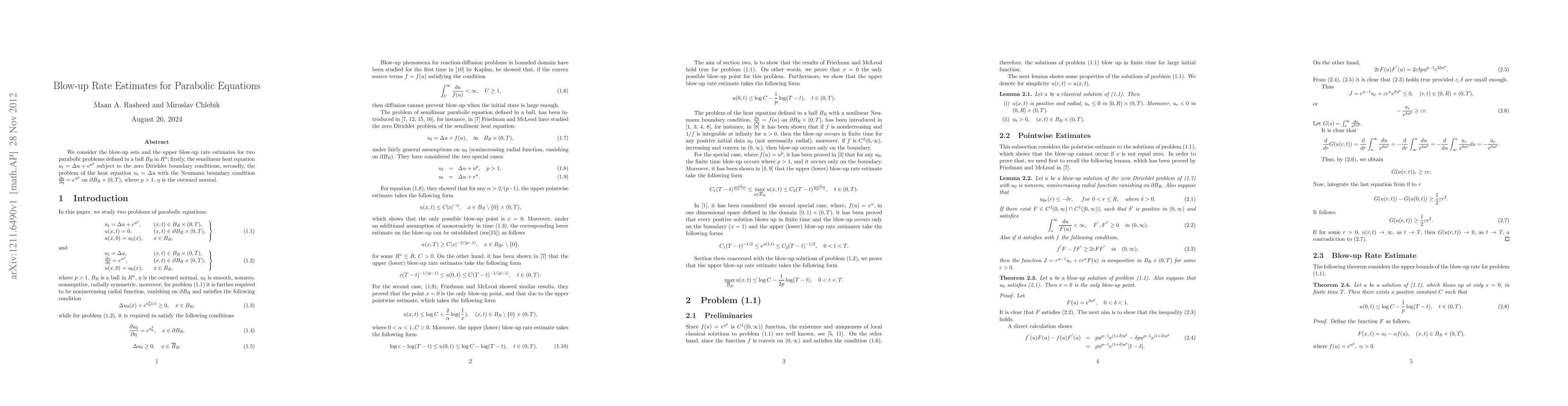 Summary: This paper investigates the blow-up sets and provides upper blow-up rate estimates for two specific parabolic equations in a ball, aiming to understand the conditions under which solutions become unbounded.