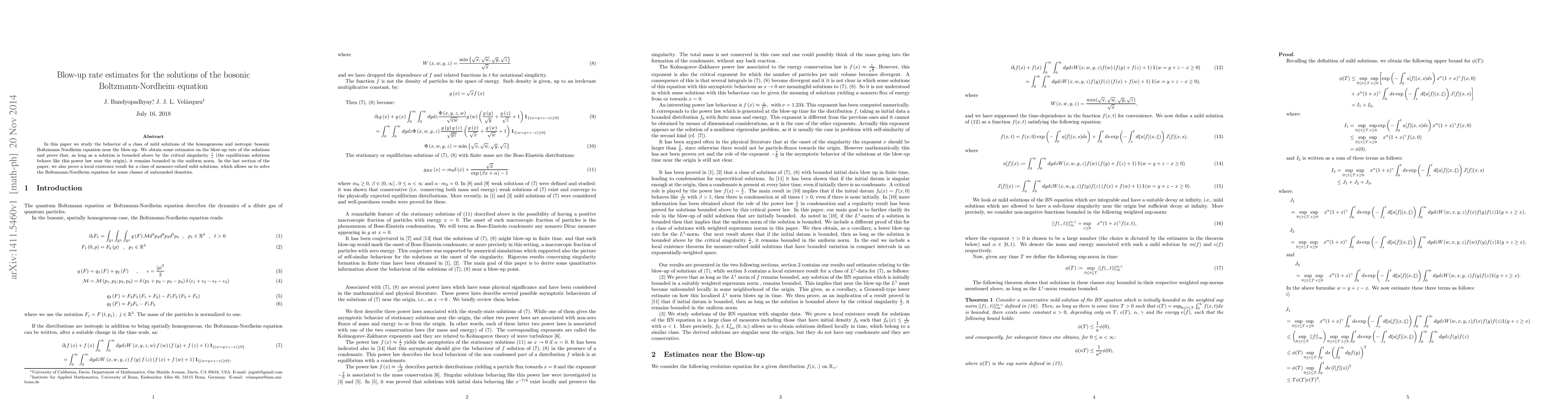 In this paper we study the behavior of a class of mild solutions of the homogeneous and isotropic bosonic Boltzmann-Nordheim equation near the blow-up. We obtain some estimates on the blow-up rate of the solutions and prove that, as long as a solution is bounded above by the critical singularity 1/x (the equilibrium solutions behave like this power law near the origin), it remains bounded in the uniform norm. In the last section of the paper, we also prove a local existence result for a class of measure-valued mild solutions, which allows us to solve the Boltzmann-Nordheim equation for some classes of unbounded densities.