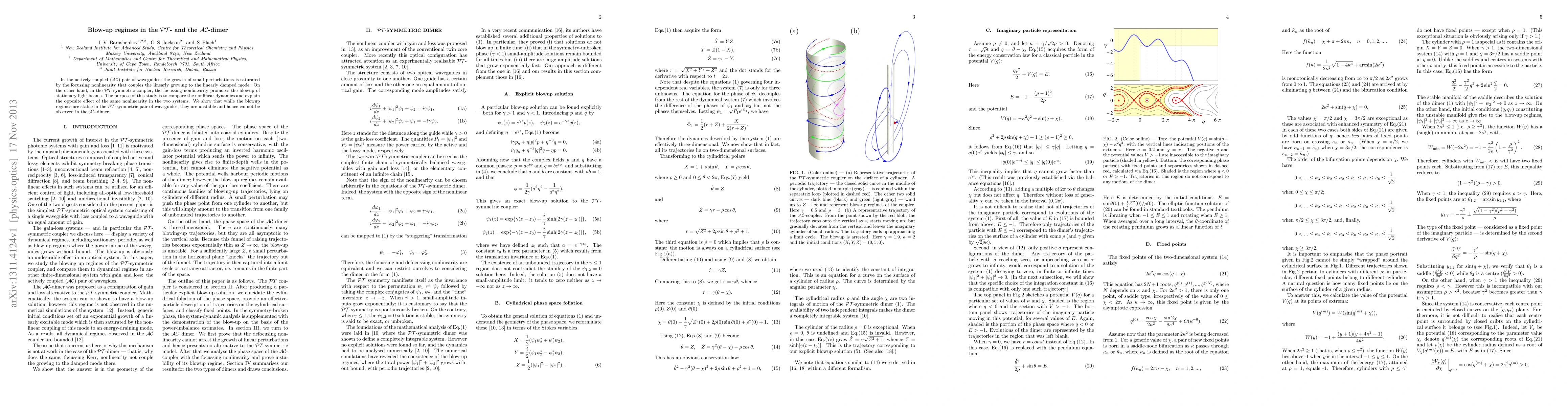 In the actively coupled ($\mathcal{AC}$) pair of waveguides, the growth of small perturbations is saturated by the focussing nonlinearity that couples the linearly growing to the linearly damped mode. On the other hand, in the $\mathcal{PT}$-symmetric coupler, the focussing nonlinearity promotes the blowup of stationary light beams. The purpose of this study is to compare the nonlinear dynamics and explain the opposite effect of the same nonlinearity in the two systems. We show that while the blowup regimes are stable in the $\mathcal{PT}$-symmetric pair of waveguides, they are unstable and hence cannot be observed in the $\mathcal{AC}$-dimer.