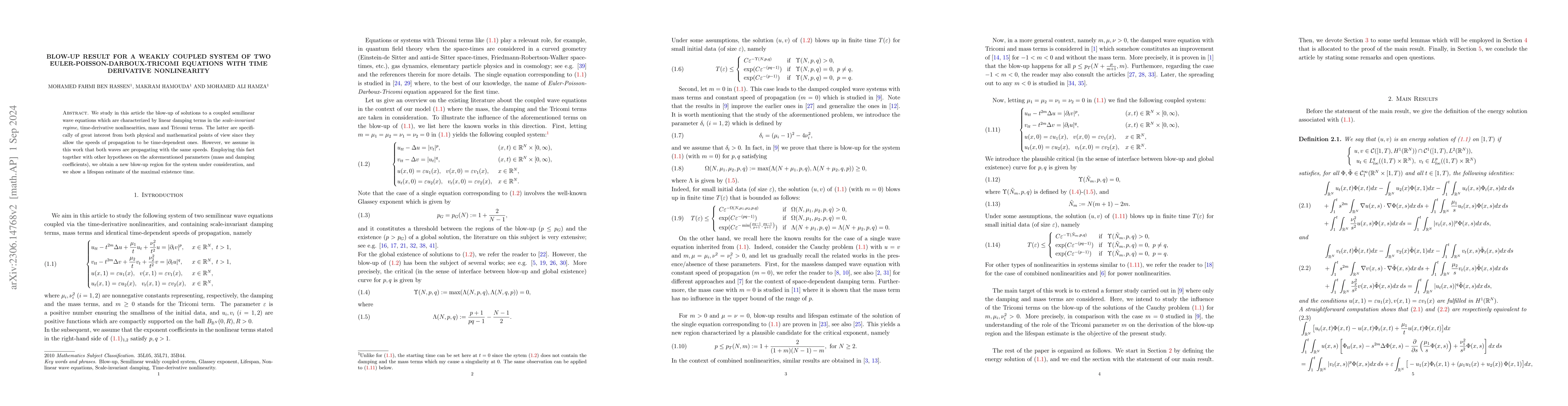 This paper investigates the blow-up behavior of solutions to a coupled system of semilinear wave equations with scale-invariant damping, mass terms, and time-derivative nonlinearities. The authors derive a new blow-up region and provide a lifespan estimate for the maximal existence time of the solutions.