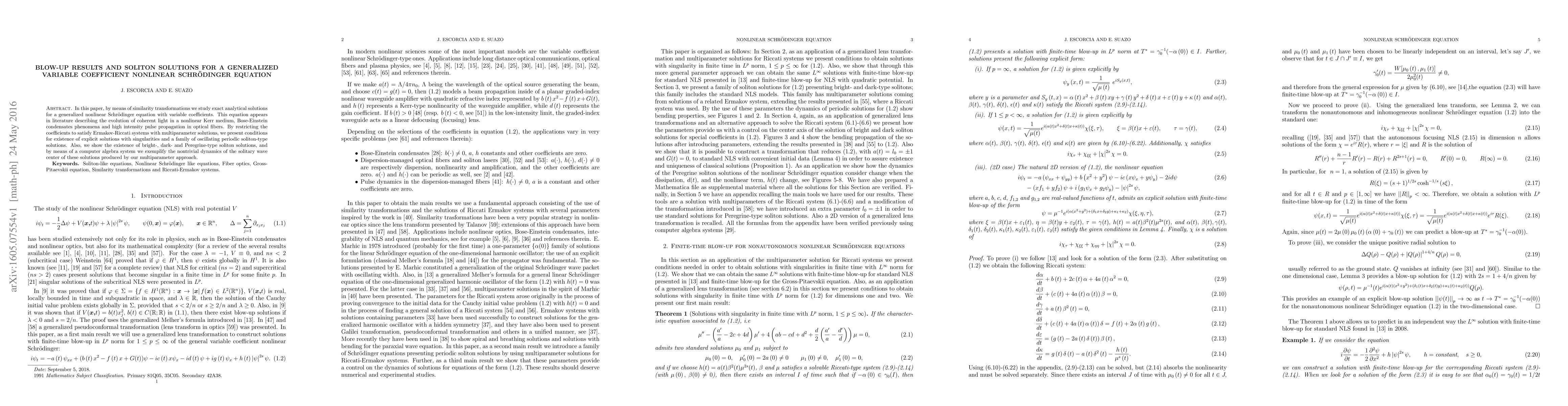 In this paper, by means of similarity transformations we study exact analytical solutions for a generalized nonlinear Schr$\ddot{\mbox{o}}$dinger equation with variable coefficients. This equation appears in literature describing the evolution of coherent light in a nonlinear Kerr medium, Bose-Einstein condensates phenomena and high intensity pulse propagation in optical fibers. By restricting the coefficients to satisfy Ermakov-Riccati systems with multiparameter solutions, we present conditions for existence of explicit solutions with singularities and a family of oscillating periodic soliton-type solutions. Also, we show the existence of bright-, dark- and Peregrine-type soliton solutions, and by means of a computer algebra system we exemplify the nontrivial dynamics of the solitary wave center of these solutions produced by our multiparameter approach.