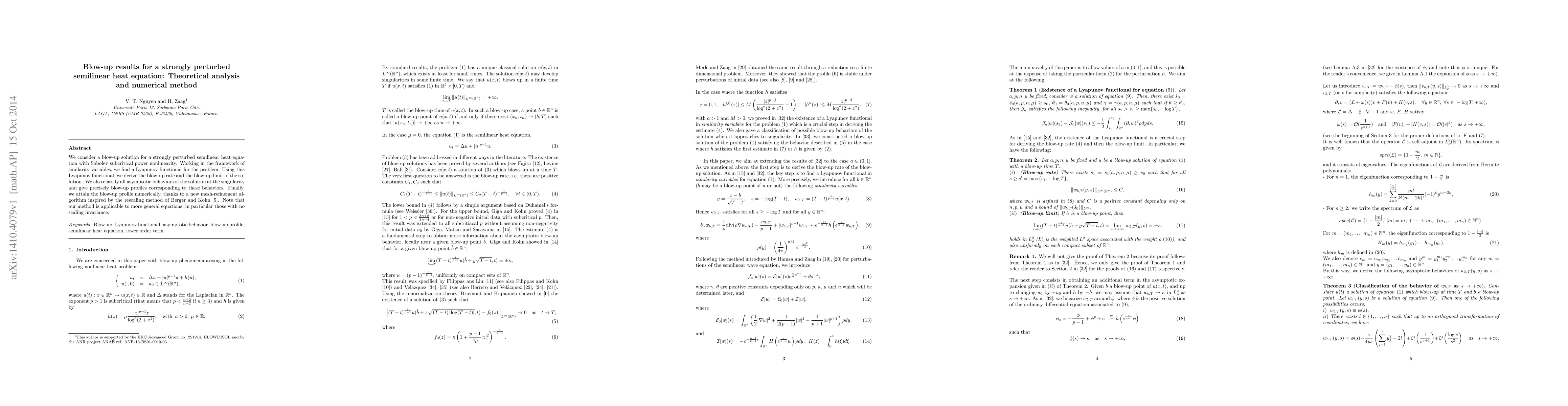 We consider a blow-up solution for a strongly perturbed semilinear heat equation with Sobolev subcritical power nonlinearity. Working in the framework of similarity variables, we find a Lyapunov functional for the problem. Using this Lyapunov functional, we derive the blow-up rate and the blow-up limit of the solution. We also classify all asymptotic behaviors of the solution at the singularity and give precisely blow-up profiles corresponding to these behaviors. Finally, we attain the blow-up profile numerically, thanks to a new mesh-refinement algorithm inspired by the rescaling method of Berger and Kohn in 1988. Note that our method is applicable to more general equations, in particular those with no scaling invariance.