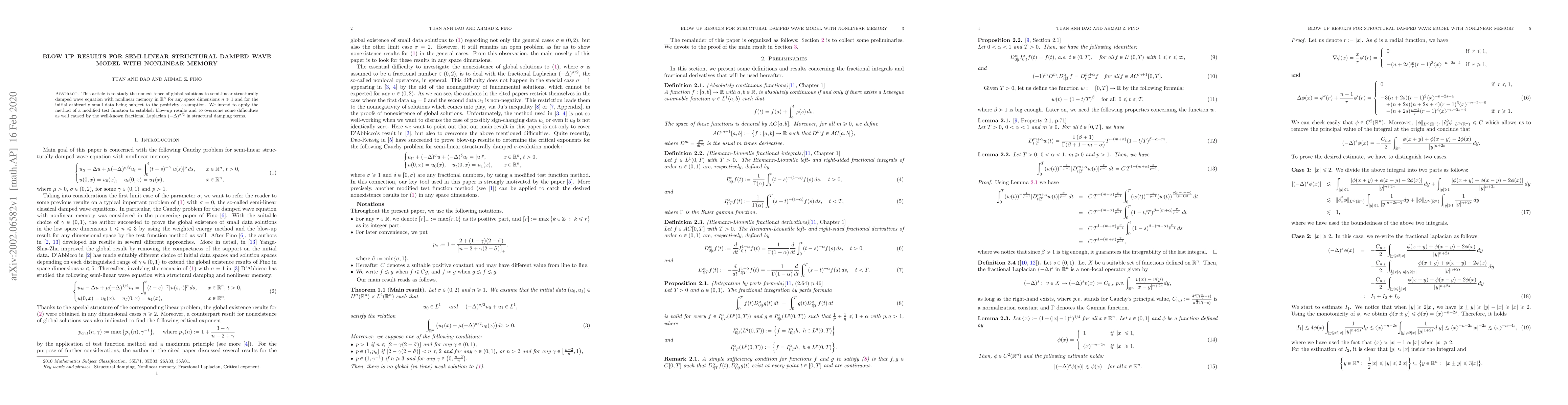 This paper investigates the nonexistence of global solutions for semi-linear structurally damped wave equations with nonlinear memory in any spatial dimension $n\ge 1$, using a modified test function approach to establish blow-up results, despite initial data being arbitrarily small and positive.