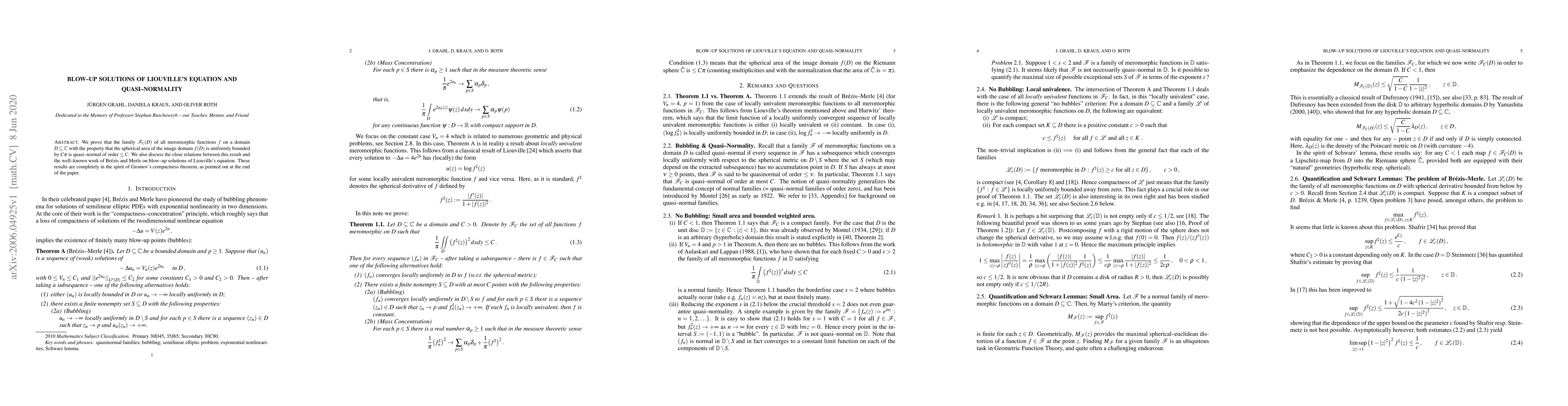 We prove that the family $\mathcal{F}_C(D)$ of all meromorphic functions $f$ on a domain $D\subseteq \mathbb{C}$ with the property that the spherical area of the image domain $f(D)$ is uniformly bounded by $C \pi$ is quasi--normal of order $\le C$. We also discuss the close relations between this result and the well--known work of Br\'ezis and Merle on blow--up solutions of Liouville's equation. These results are completely in the spirit of Gromov's compactness theorem, as pointed out at the end of the paper.