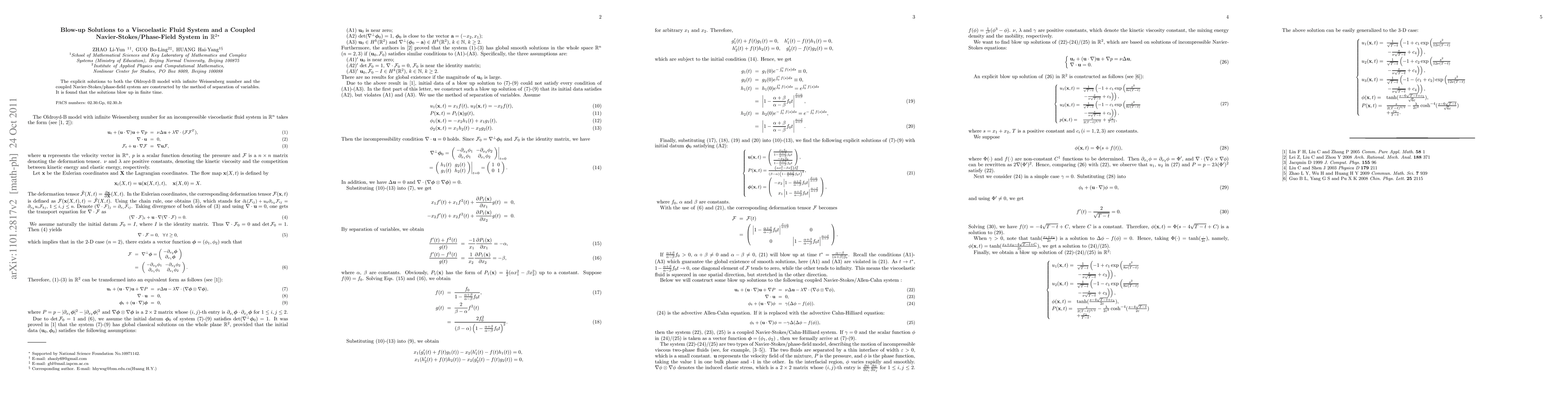 Summary: This paper presents explicit blow-up solutions for the Oldroyd-B model at infinite Weissenberg number and for a coupled Navier-Stokes/Phase-Field system, demonstrating finite-time blow-up in two-dimensional space.