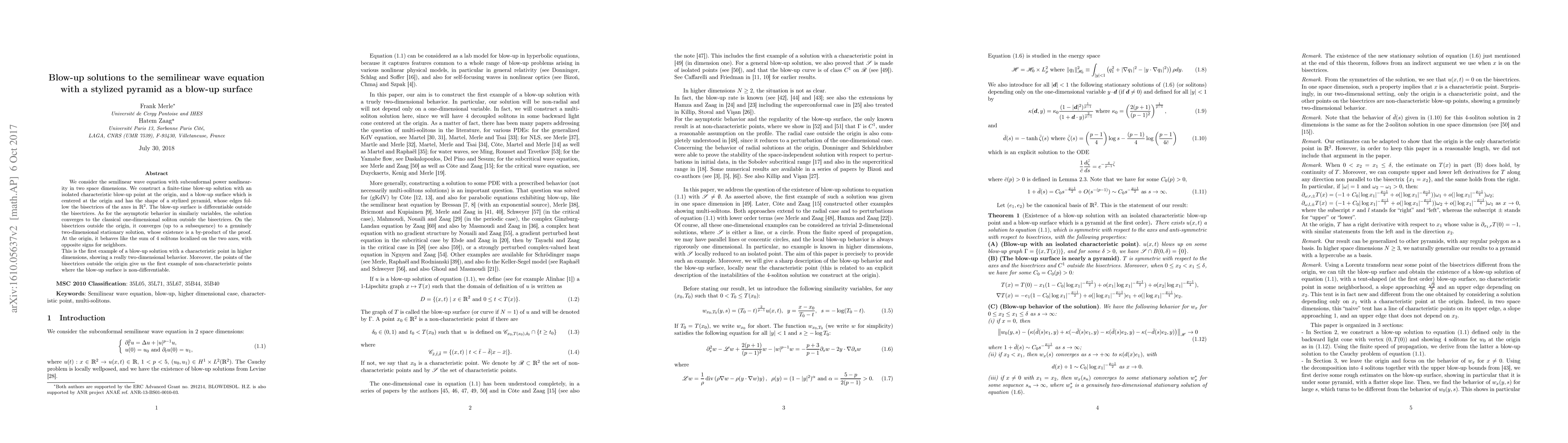 This paper constructs a finite-time blow-up solution for the semilinear wave equation in two dimensions, featuring a pyramidal blow-up surface centered at the origin. The solution exhibits two-dimensional behavior and non-differentiability at non-characteristic points on the bisectrices.