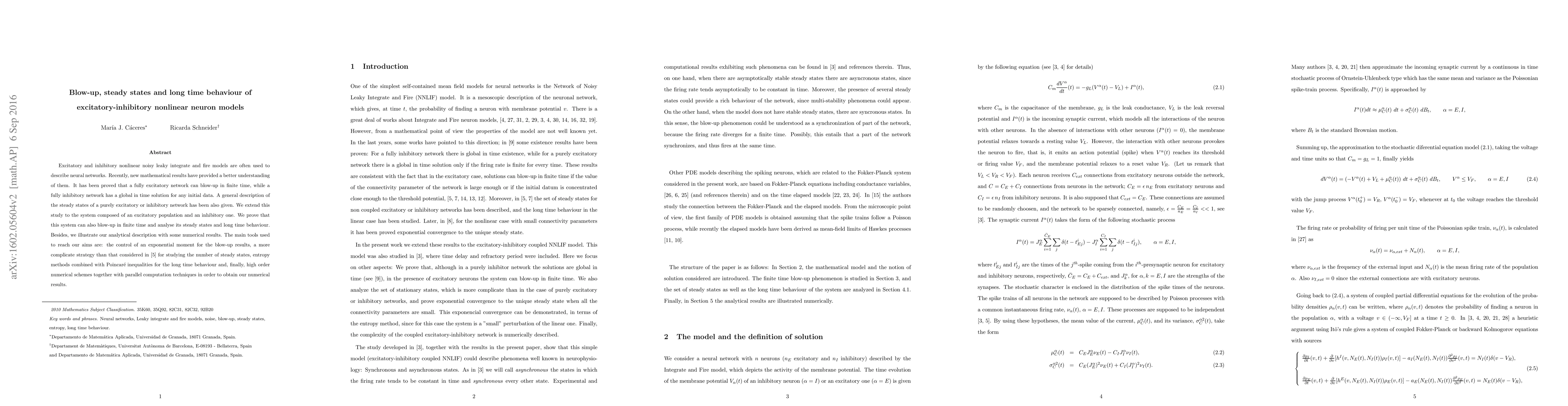 This paper investigates the blow-up phenomena, steady states, and long-time behavior in excitatory-inhibitory nonlinear neuron models. It proves that mixed excitatory-inhibitory networks can blow-up in finite time and provides a detailed analysis of their steady states and long-time dynamics using advanced mathematical and numerical techniques.