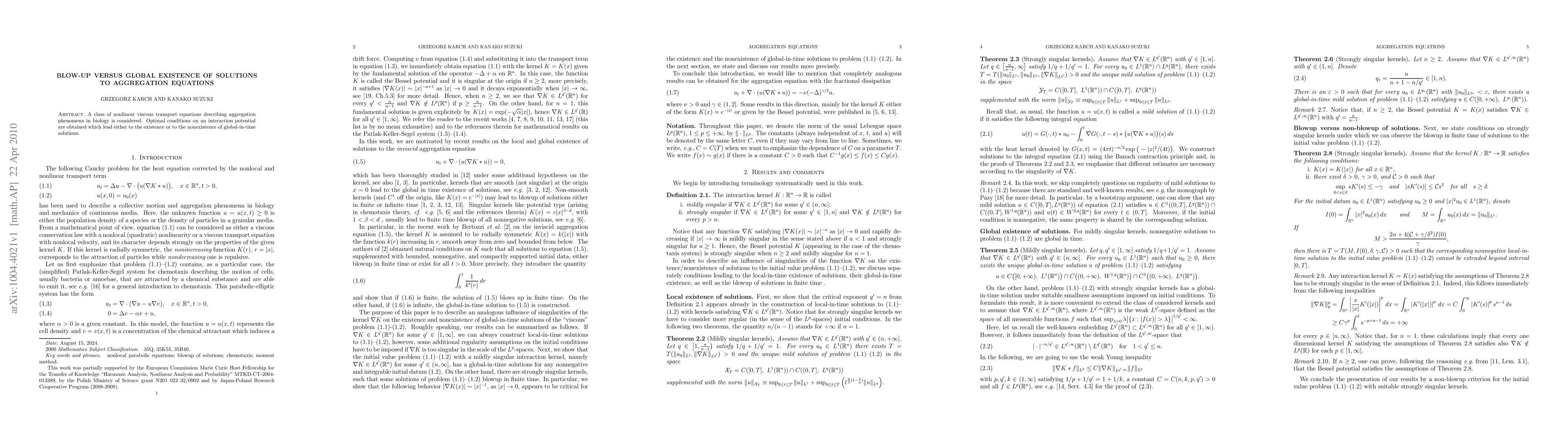 A class of nonlinear viscous transport equations describing aggregation phenomena in biology is considered. Optimal conditions on an interaction potential are obtained which lead either to the existence or to the nonexistence of global-in-time solutions.