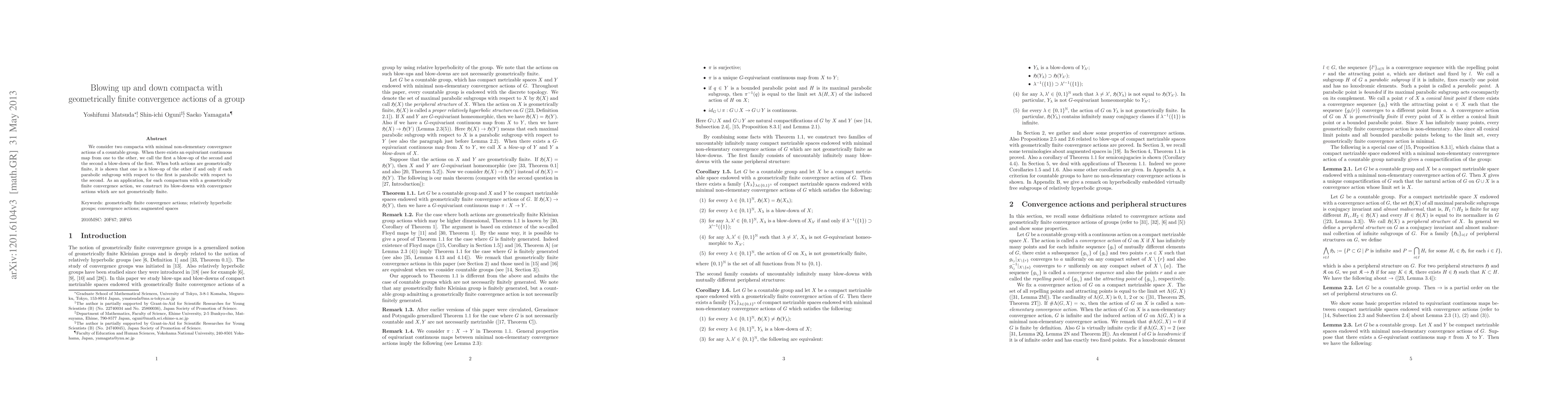 This paper explores the relationship between two compacta with geometrically finite convergence actions of a countable group, defining blow-up and blow-down scenarios when an equivariant map exists. It proves that one compactum is a blow-up of the other if each parabolic subgroup in the first is parabolic in the second. The study also constructs blow-downs of compacta with convergence actions that are not geometrically finite.