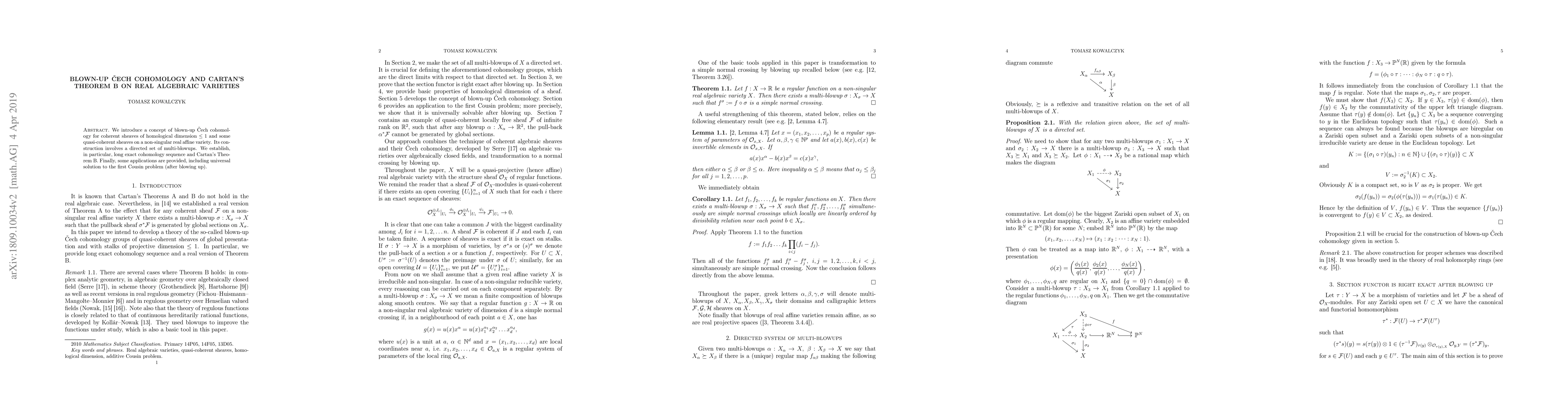This paper introduces blown-up \v{C}ech cohomology for coherent sheaves on real algebraic varieties, constructs a long exact cohomology sequence, and proves Cartan's Theorem B. Applications include a universal solution to the first Cousin problem post-blowing up.