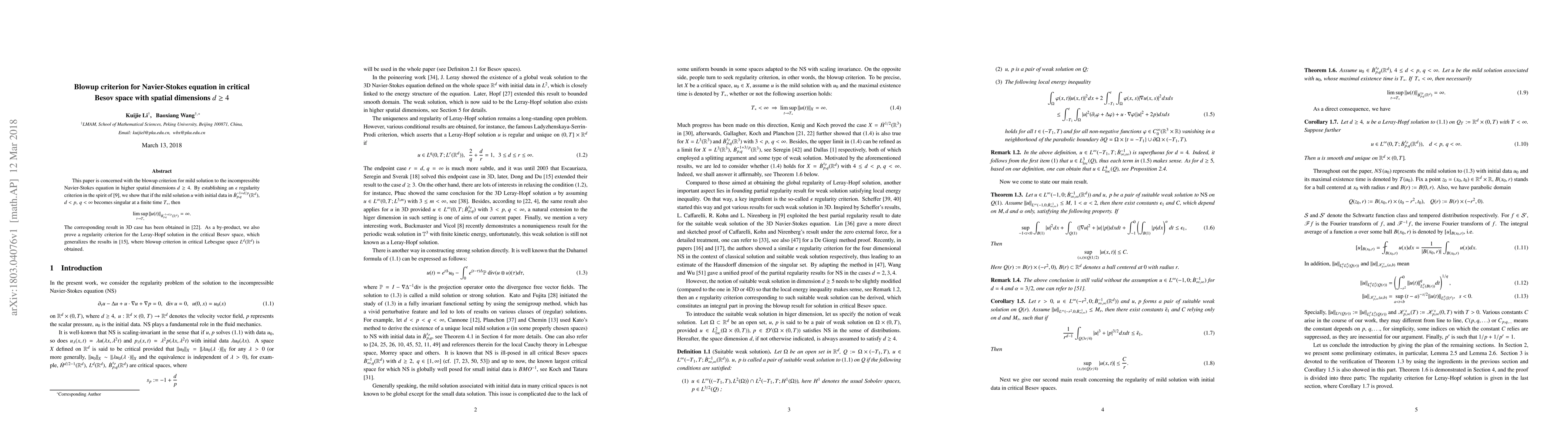 This paper establishes a blowup criterion for mild solutions to the incompressible Navier-Stokes equation in spatial dimensions $d \geq 4$, showing that singularity occurs if $\limsup_{t\to T_*} \|u(t)\|_{\dot B^{-1+d/p}_{p,q}(\mathbb{R}^d)} = \infty$. It also generalizes a regularity criterion for Leray-Hopf solutions in the critical Besov space.