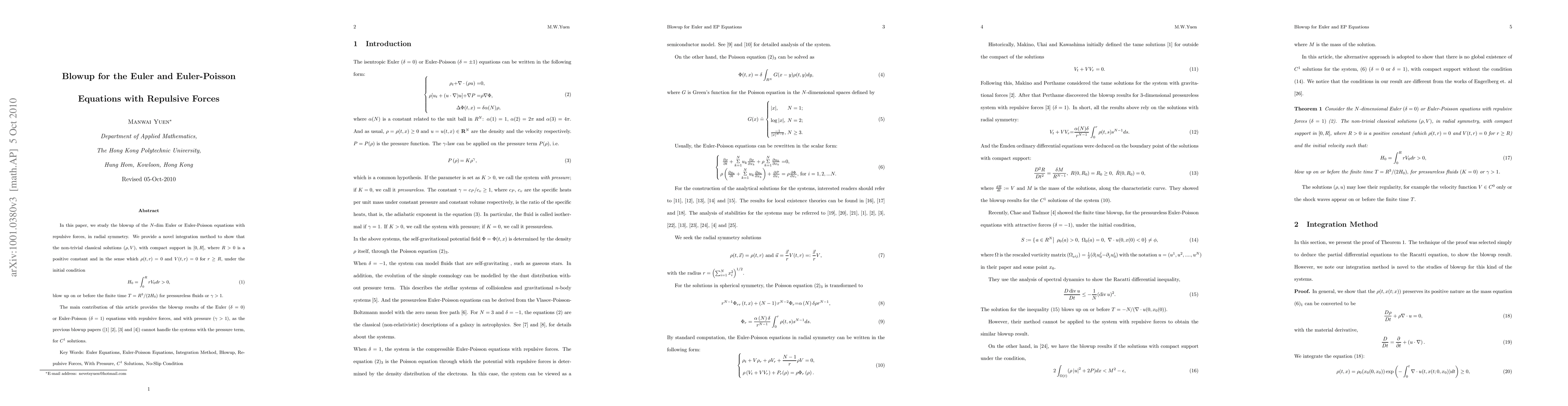 This paper investigates the blowup behavior of the $N$-dimensional Euler and Euler-Poisson equations with repulsive forces under radial symmetry. It introduces a new integration method to demonstrate that solutions with compact support blow up by time $T=R^3/(2H_0)$ when $H_0 > 0$, extending previous results to include pressure terms.