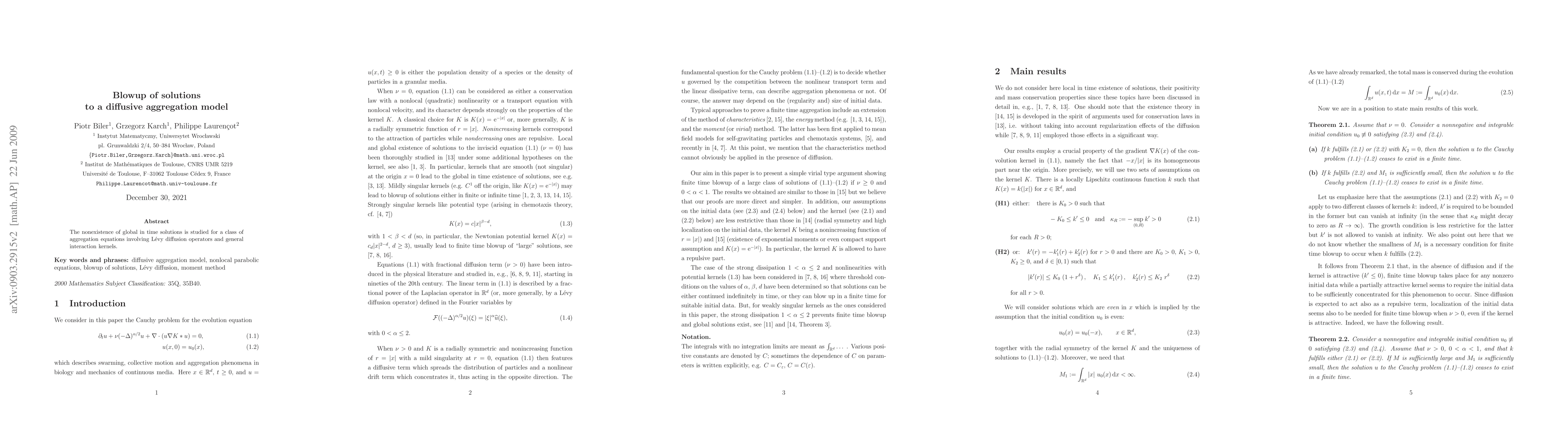The nonexistence of global in time solutions is studied for a class of aggregation equations involving L\'evy diffusion operators and general interaction kernels.