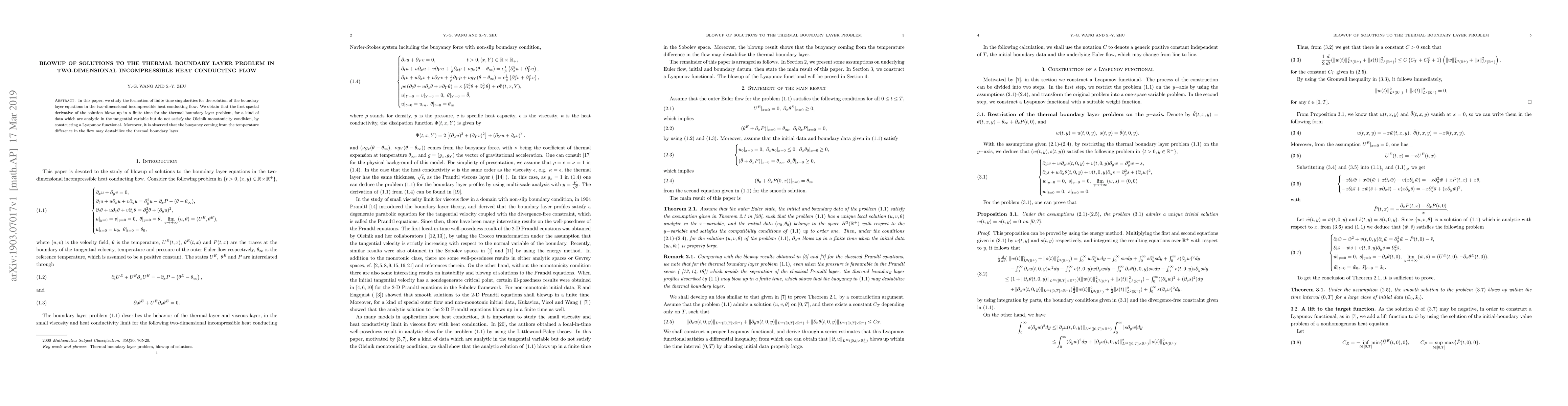 In this paper, we study the formation of finite time singularities for the solution of the boundary layer equations in the two-dimensional incompressible heat conducting flow. We obtain that the first spacial derivative of the solution blows up in a finite time for the thermal boundary layer problem, for a kind of data which are analytic in the tangential variable but do not satisfy the Oleinik monotonicity condition, by constructing a Lyapunov functional. Moreover, it is observed that the buoyancy coming from the temperature difference in the flow may destabilize the thermal boundary layer.