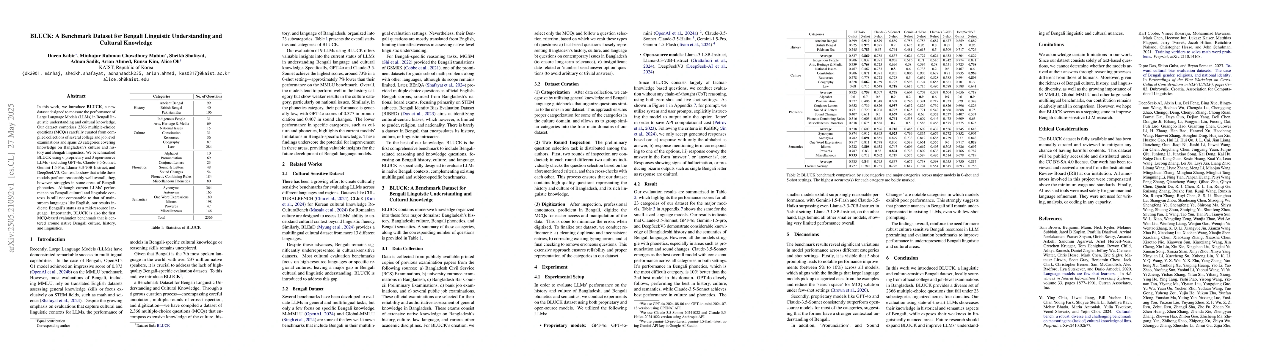 This research introduces BLUCK, a dataset to evaluate how well AI models understand Bengali language and culture, revealing that current models perform reasonably but still struggle with some phonetic aspects. It highlights Bengali as a mid-resource language and provides a new benchmark focused on native cultural and linguistic knowledge.
