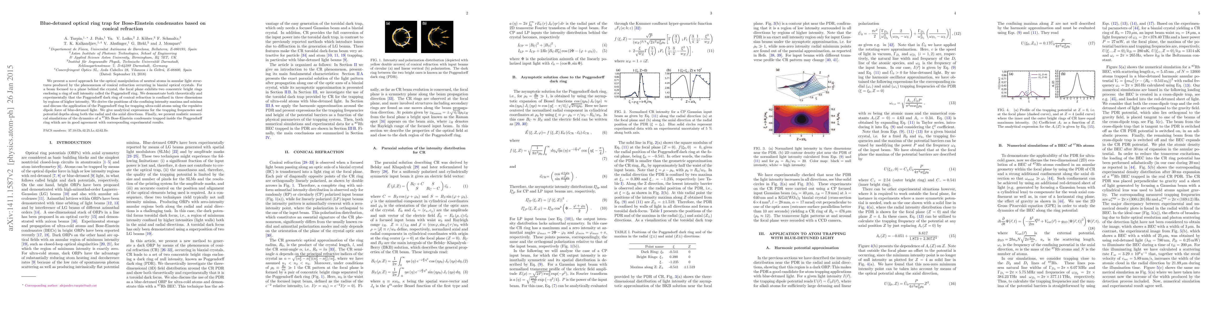 This paper introduces a novel optical trap for Bose-Einstein condensates using conical refraction in biaxial crystals, creating annular light structures with a central dark ring. The Poggendorff ring is shown to trap atoms via repulsive dipole forces, with analytical and numerical simulations confirming the trapping dynamics.