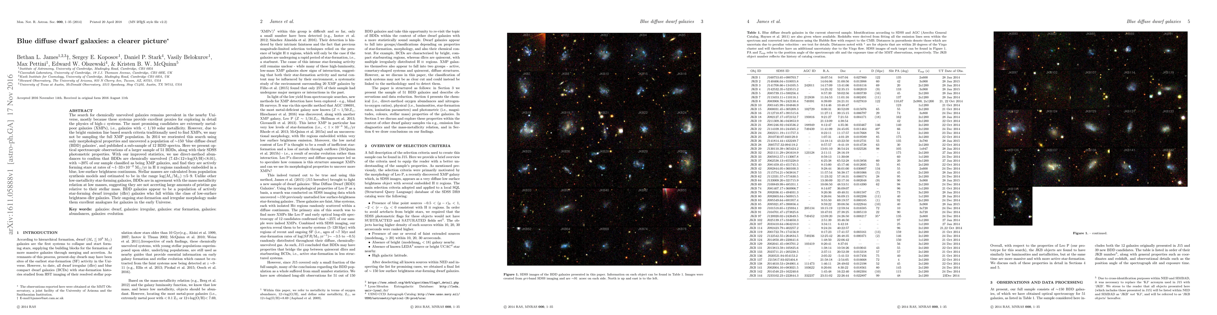 This paper presents spectroscopic observations of 51 blue diffuse dwarf (BDD) galaxies, confirming their chemically unevolved nature and active star formation. BDDs, with metallicities below 1/10 solar, align well with the mass-metallicity relation, indicating they are not accreting large amounts of pristine gas, and serve as excellent analogues for early Universe galaxies.