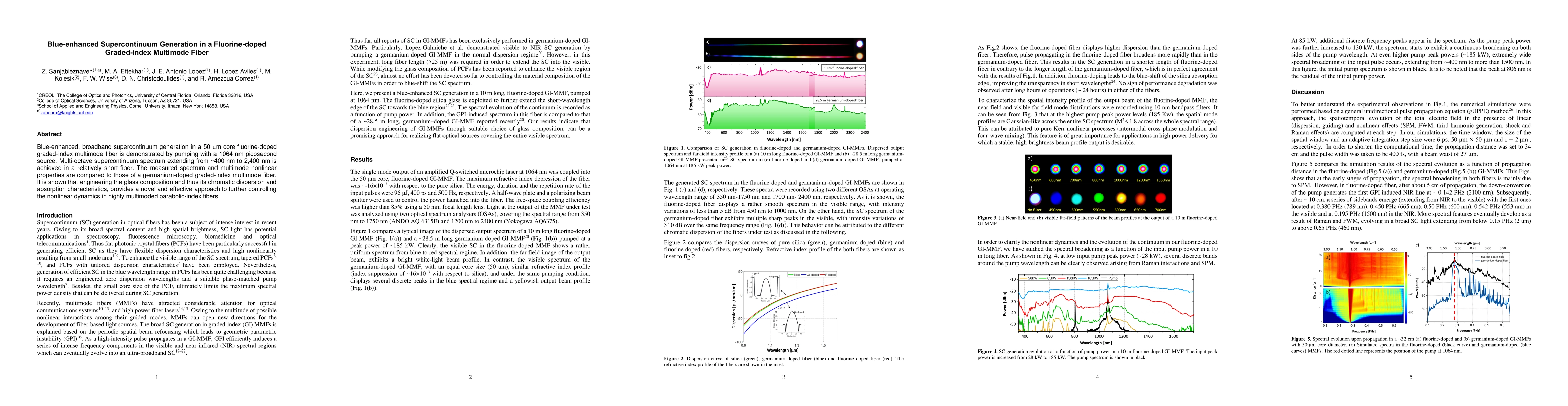 This paper demonstrates blue-enhanced broadband supercontinuum generation in fluorine-doped graded-index multimode fiber using a 1064 nm picosecond source, achieving a spectrum from ~400 nm to 2,400 nm. It shows that modifying glass composition to adjust chromatic dispersion and absorption enhances control over nonlinear dynamics in multimode fibers.
