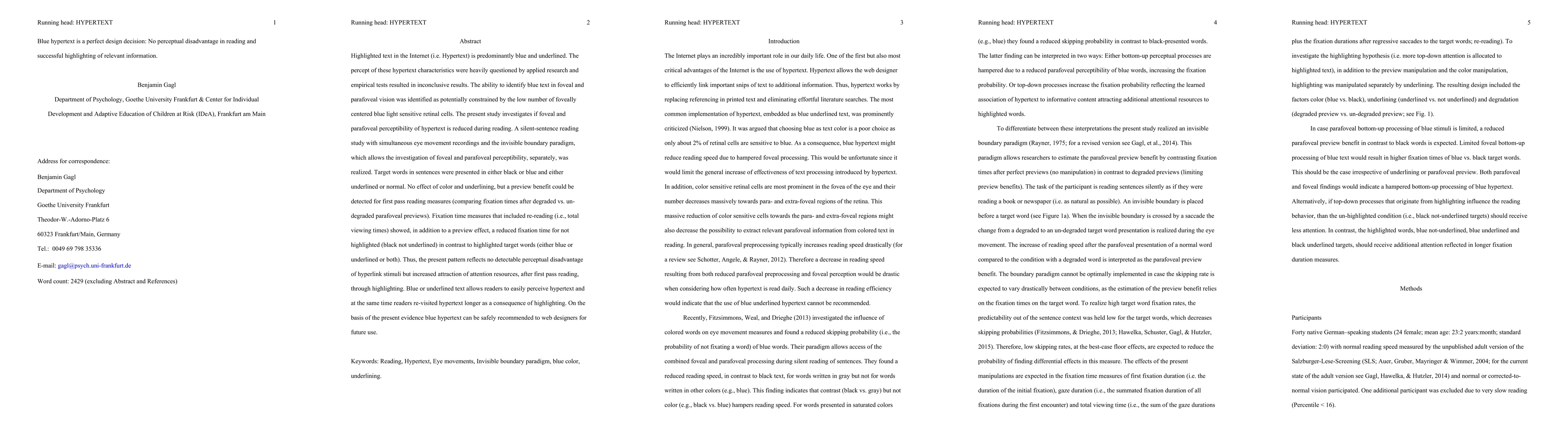 Highlighted text in the Internet (i.e. Hypertext) is predominantly blue and underlined. The percept of these hypertext characteristics were heavily questioned by applied research and empirical tests resulted in inconclusive results. The ability to identify blue text in foveal and parafoveal vision was identified as potentially constrained by the low number of foveally centered blue light sensitive retinal cells. The present study investigates if foveal and parafoveal perceptibility of hypertext is reduced during reading. A silent-sentence reading study with simultaneous eye movement recordings and the invisible boundary paradigm, which allows the investigation of foveal and parafoveal perceptibility, separately, was realized. Target words in sentences were presented in either black or blue and either underlined or normal. No effect of color and underlining, but a preview benefit could be detected for first pass reading measures (comparing fixation times after degraded vs. un- degraded parafoveal previews). Fixation time measures that included re-reading (i.e., total viewing times) showed, in addition to a preview effect, a reduced fixation time for not highlighted (black not underlined) in contrast to highlighted target words (either blue or underlined or both). Thus, the present pattern reflects no detectable perceptual disadvantage of hyperlink stimuli but increased attraction of attention resources, after first pass reading, through highlighting. Blue or underlined text allows readers to easily perceive hypertext and at the same time readers re-visited hypertext longer as a consequence of highlighting. On the basis of the present evidence blue hypertext can be safely recommended to web designers for future use.